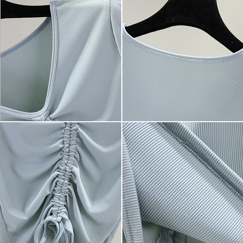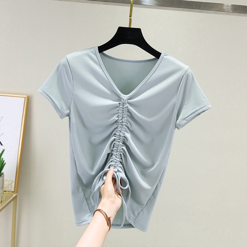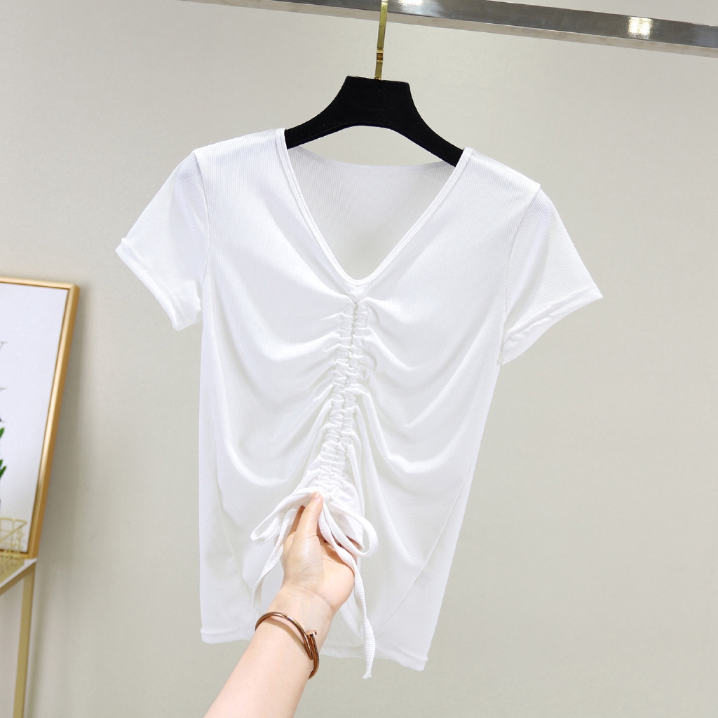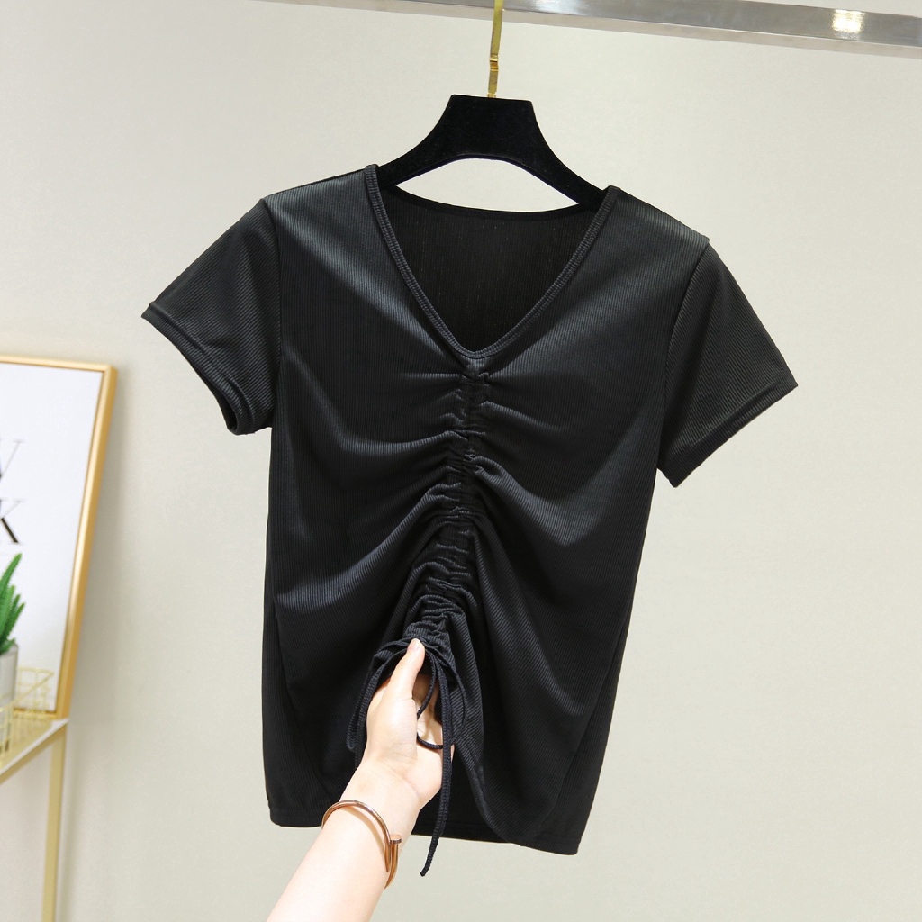 Ready Stock Women Drawstring T shirt Summer Short Sleeves V-neck Thread Cotton Korean Plain Tee Basic Casual Tops M-2XL