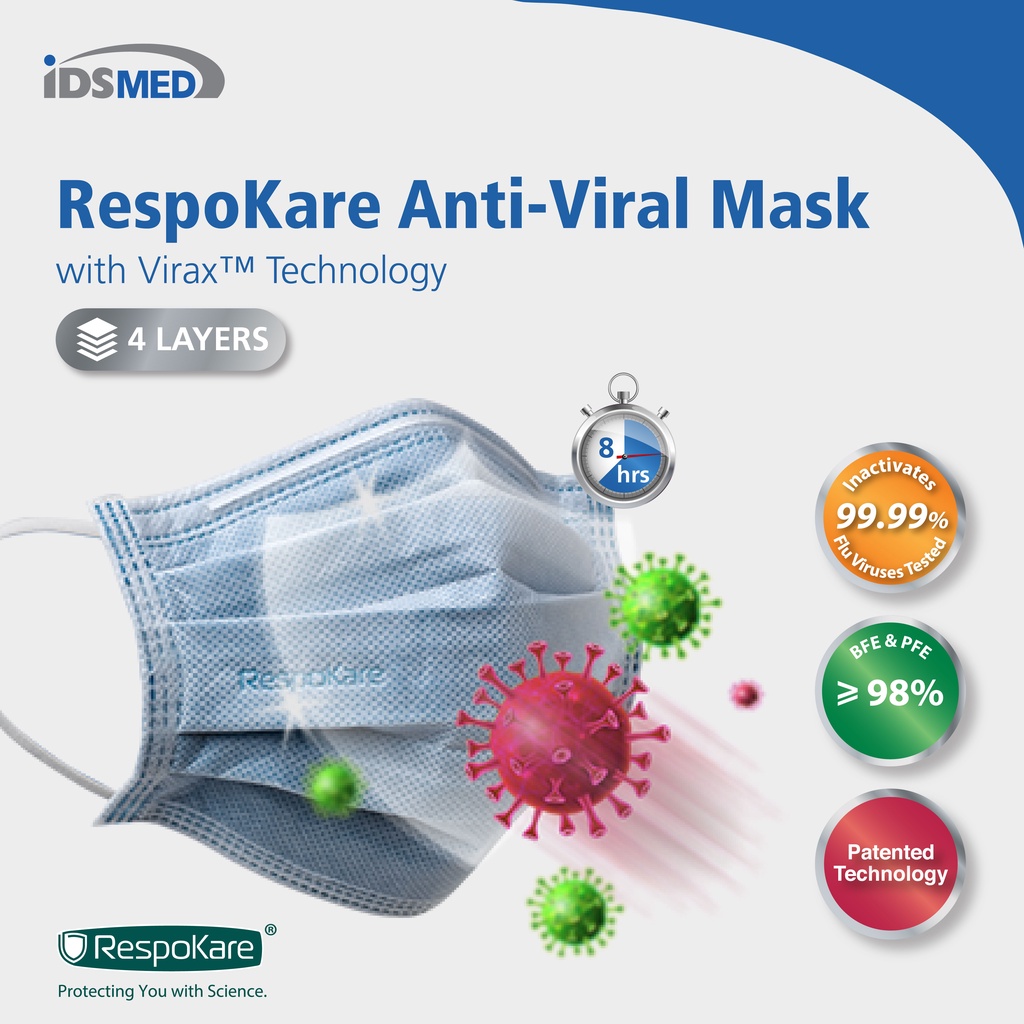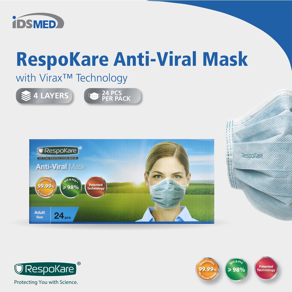 RespoKare Anti Viral Flat Face Mask 4 layers Virax Technology FDA Cleared Patented Technology (5/24 Pcs/Pack)