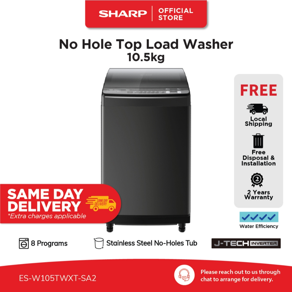 SHARP 8.5kg / 9.5kg / 10.5kg No-Holes Tub Top Load Washer (4 Ticks) - ES-W85TWXT-SA2 / ES-W95TWXT-SA2 / ES-W105TWXT-SA2