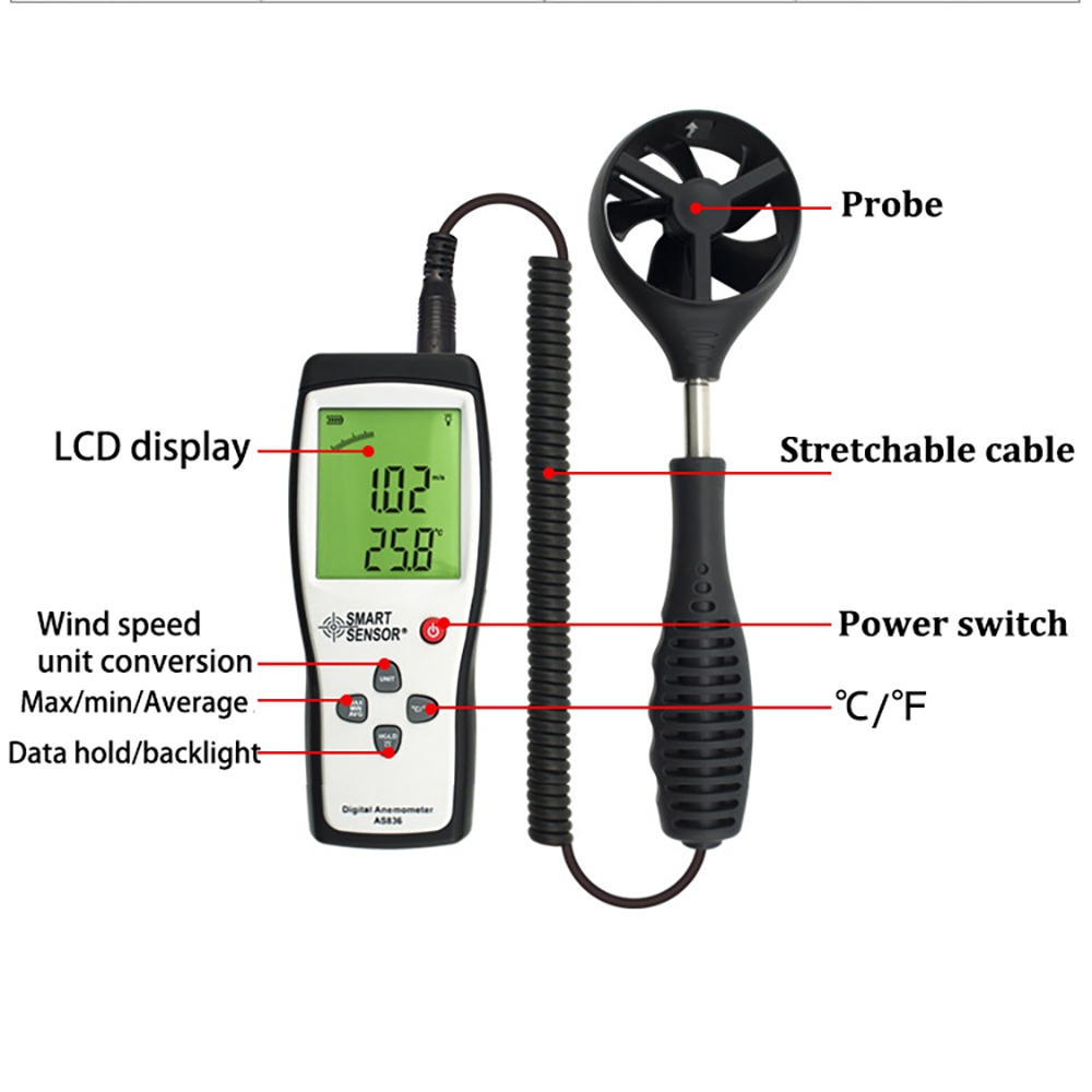 SMART SENSOR AS836 Digital Air-Flow Gauge Anemometer Wind Speed Meter Temperature 0.3-45m/s Anemometer Wind Sensor Meter