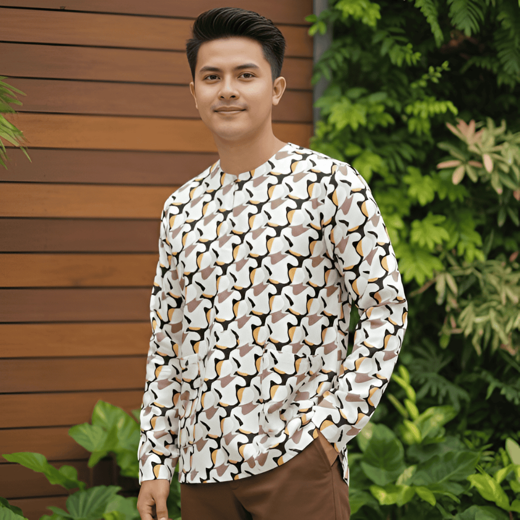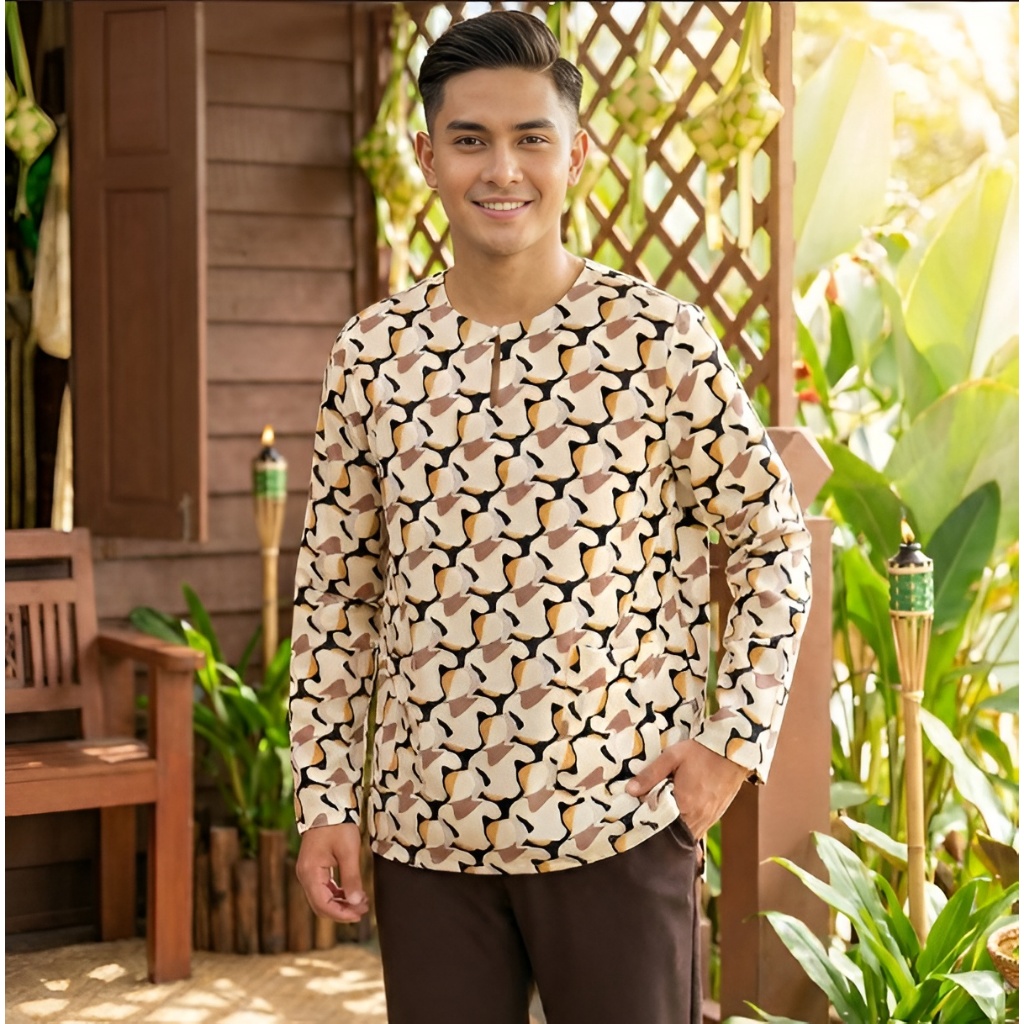 Salang Family Raya Baju Melayu Men Teluk Belanga Kurta Long Sleeve Brown Print Shirt Top Muslimah