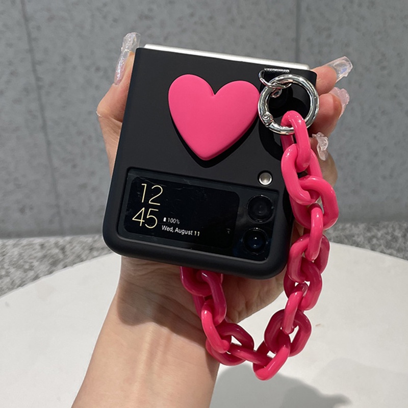 Samsung Galaxy Z Flip 6 5 4 3 Flip5 Flip6 5G Fashion Cute Pink Cartoon 3D Love Heart With Portable Wrist Hand Chain Matte Skin Phone Case Woman Black Hard PC Slim Cover