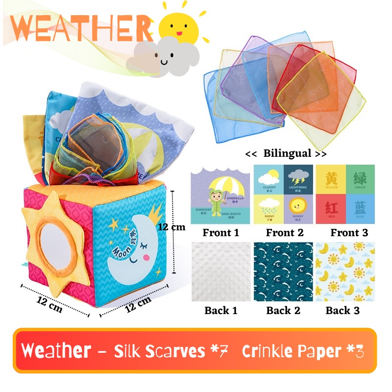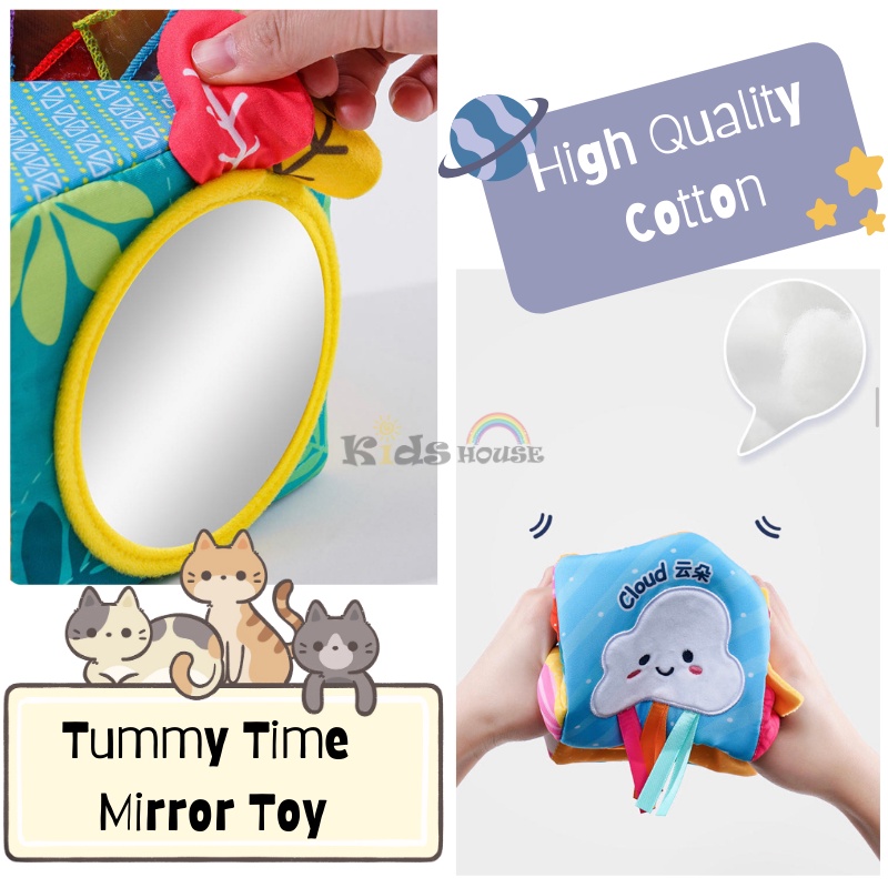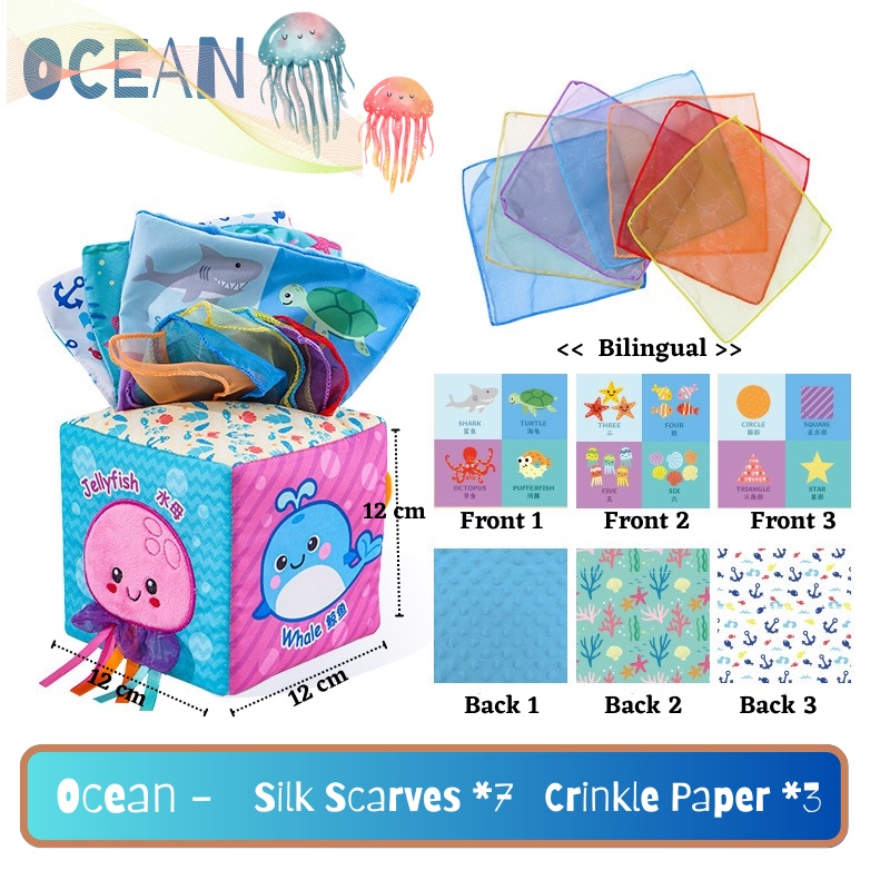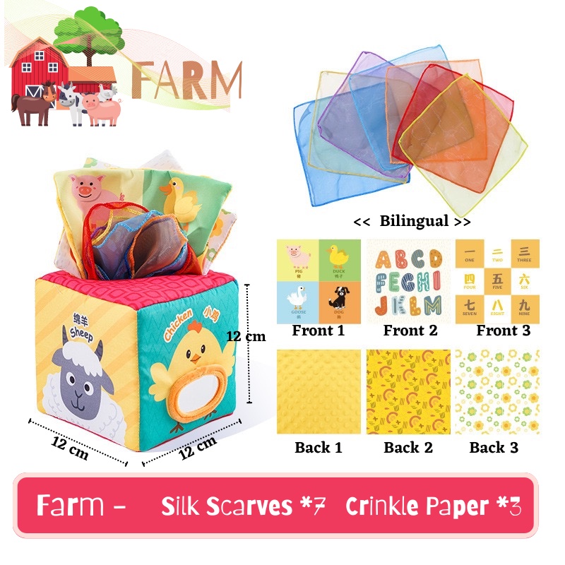 Sensory Tummy Time Fun: Montessori-style Pull Along Baby Tissue Box Toy with Mirror for Babies and Toddlers Farm Jungle