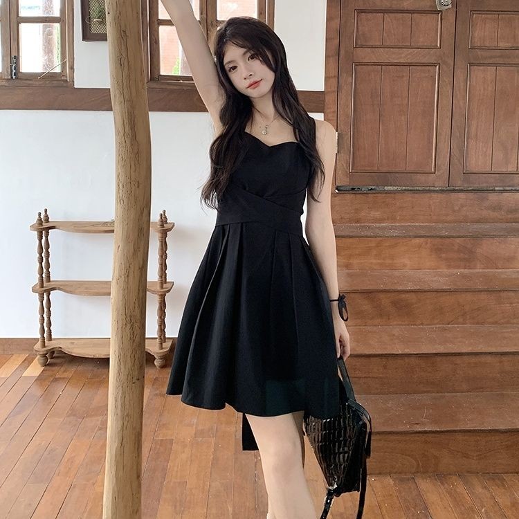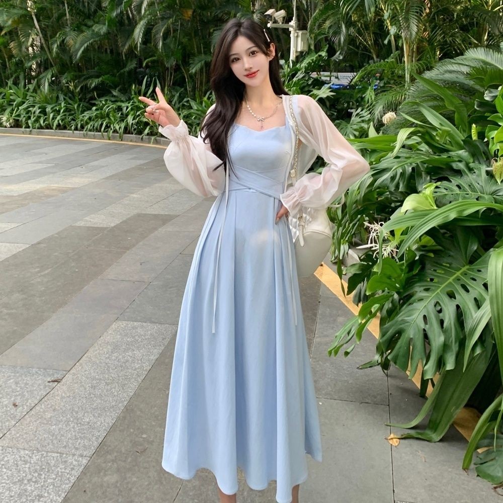 Summer New Plain Blue Cross Strap Slip Waist Maxi Dress + Thin Cardigan Set