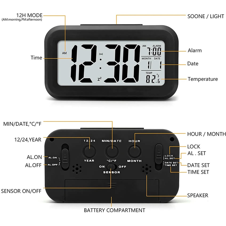 Smart Digital Clock Time Alarm Date Snooze Temperature Night Light Sensor Home Office LED Display