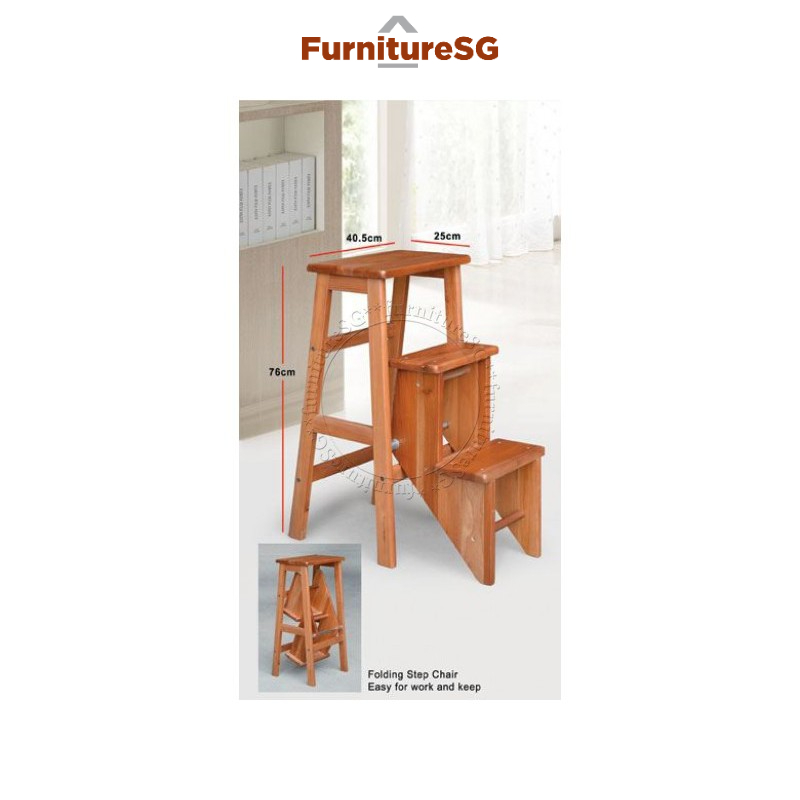 (FurnitureSG) Soild Wooden Metal Step Ladder Chair Compact Easy Storage