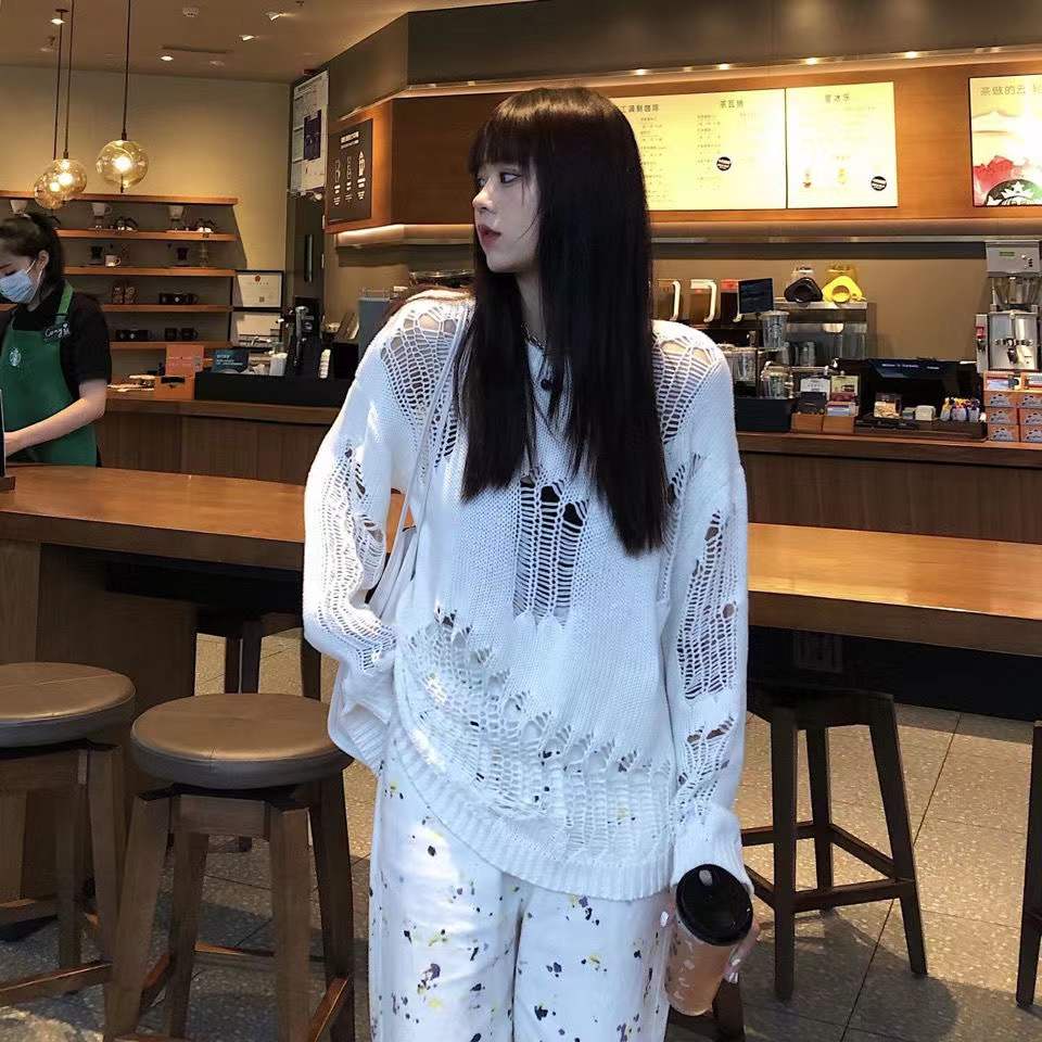 Spring Autumn Korean Version Simple Casual Ripped Loose Pendant Slimmer Look Line Knitted Sweater Niche Top Women