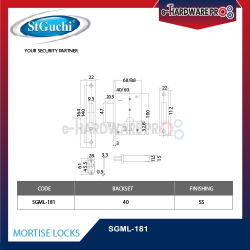 St Guchi SGML-H181 SS Sliding Mortise Double Hook Lock St Guchi Lock St Guchi Door Lock St Guchi Mortise Lock