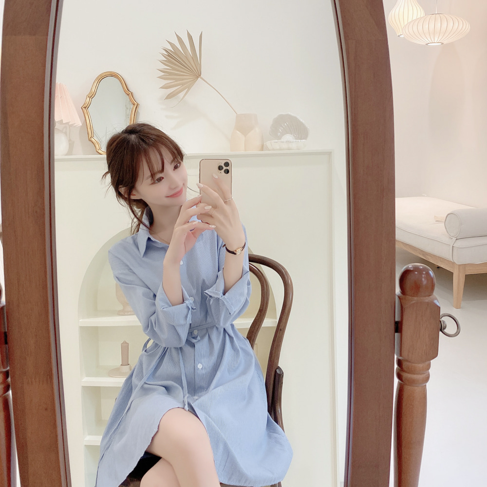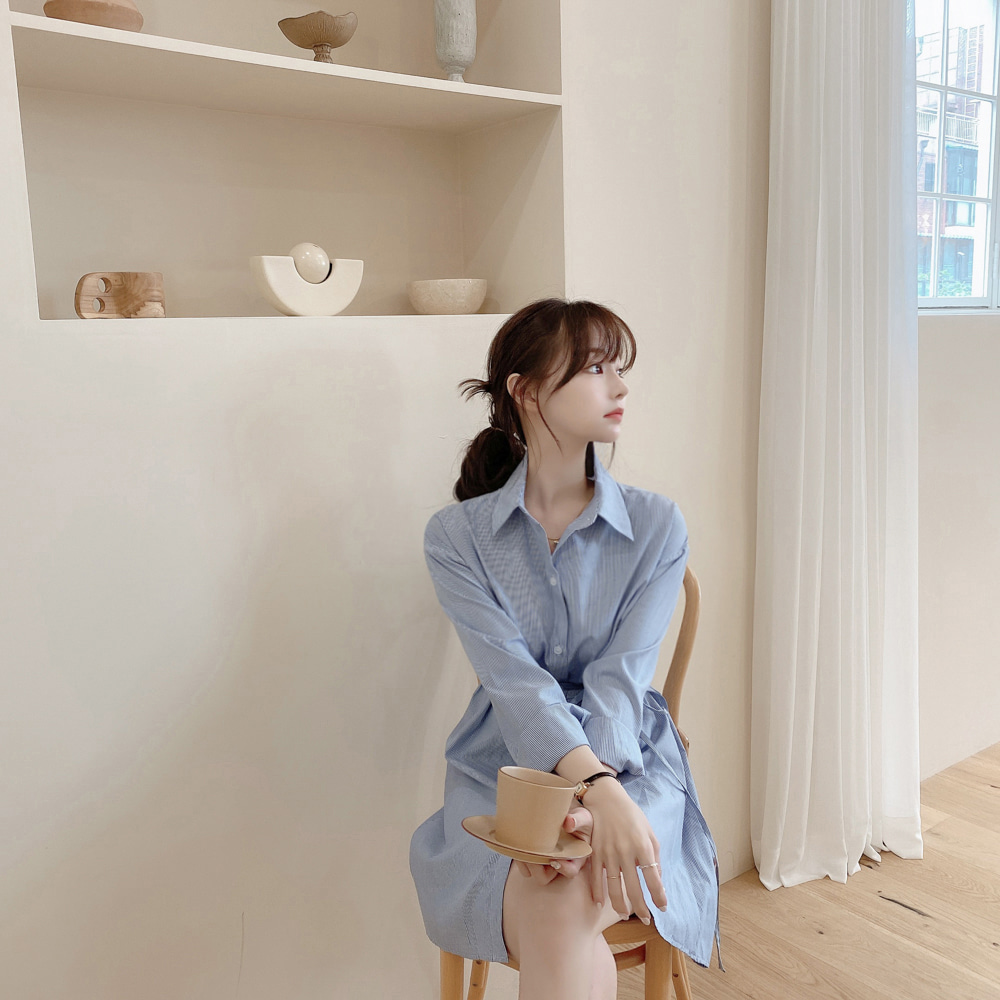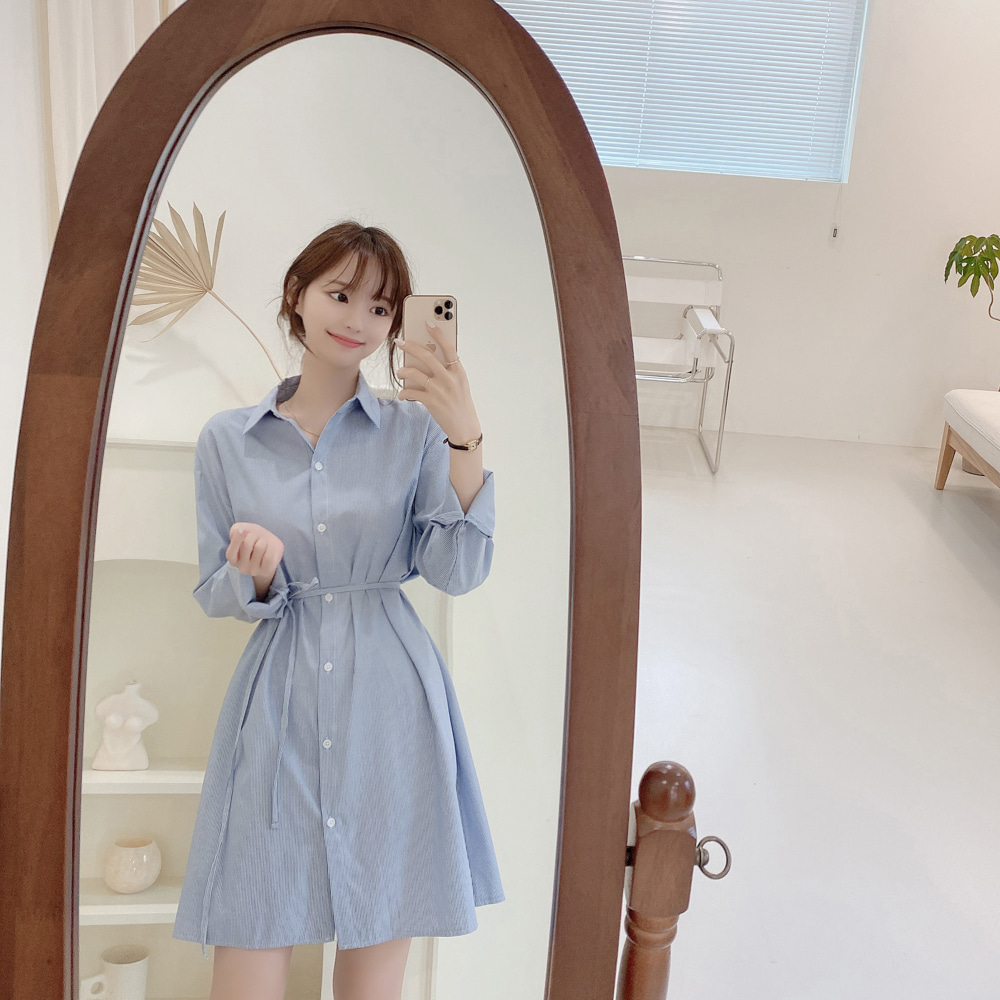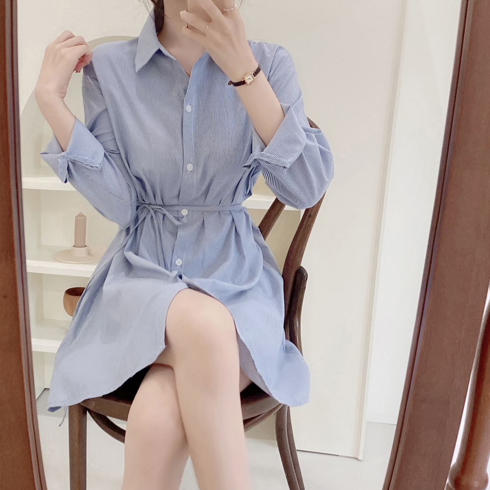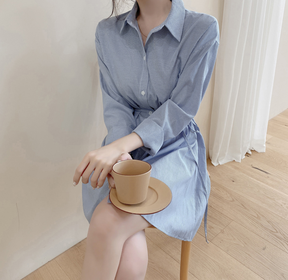 SUXI Korean Simple Lapel Blue Stripe Mid Length Lace Up Shirt Mini Women's Dress