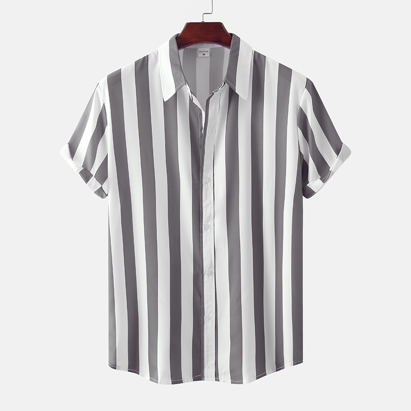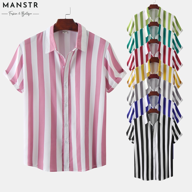 Summer New Men's All-match Classic Short Sleeve Striped Shirt Button Up Lapel Casual Loose Plus Size Tops Pink\Emerald green\Royal blue\Grey\Red\Yellow\Black