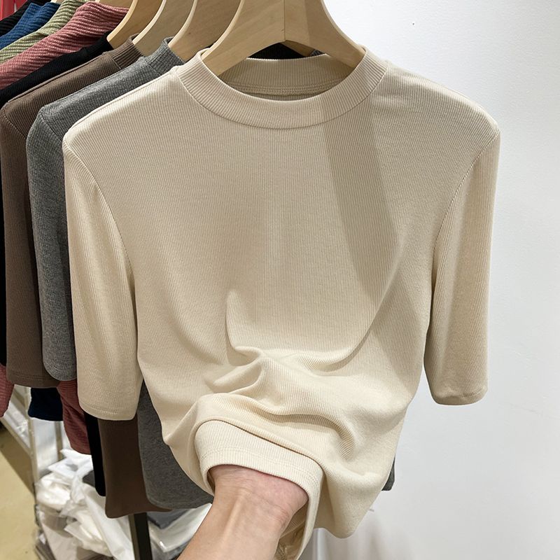 Summer women's half high neck solid color T-shirt mid-sleeve crewneck slim fit