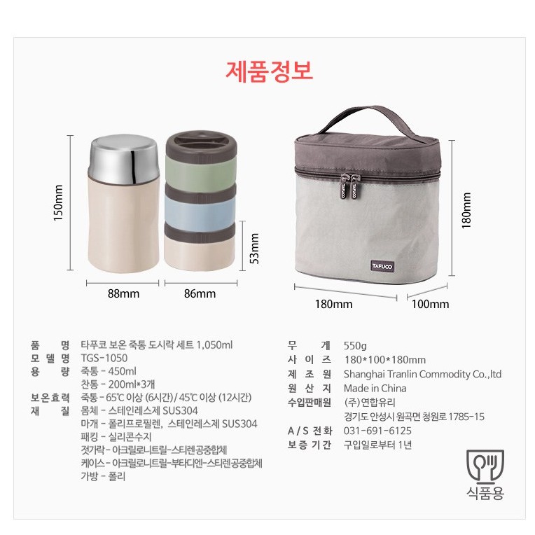 TAFUCO Stainless Steel Thermal Lunch Box With Bag Set 1050ml