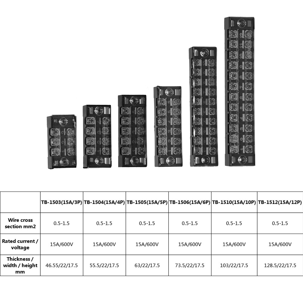 TB-1503 TB1504 TB1506 TB1508 TB1510 TB1512 Dual Row Strip Screw Terminal Block 15A 600V Fixed Wiring Board wire connector(screw color random)