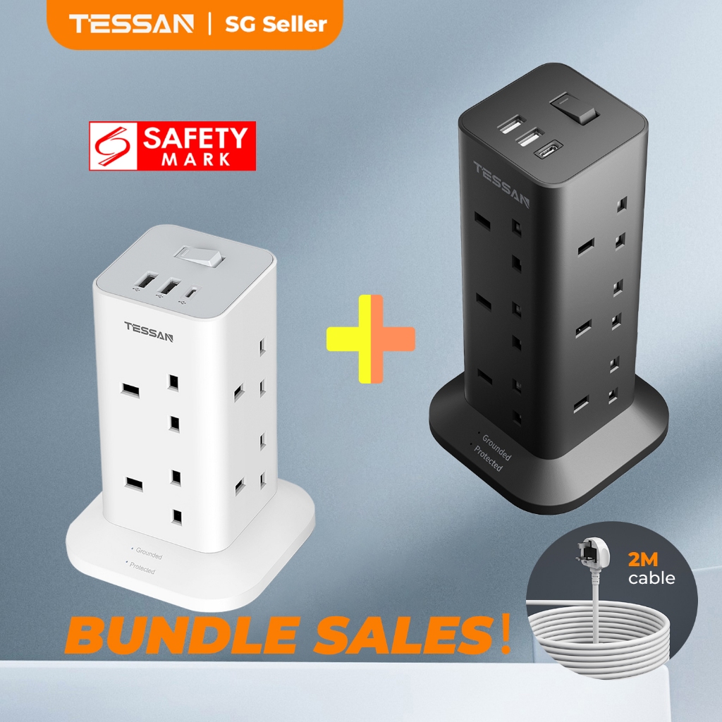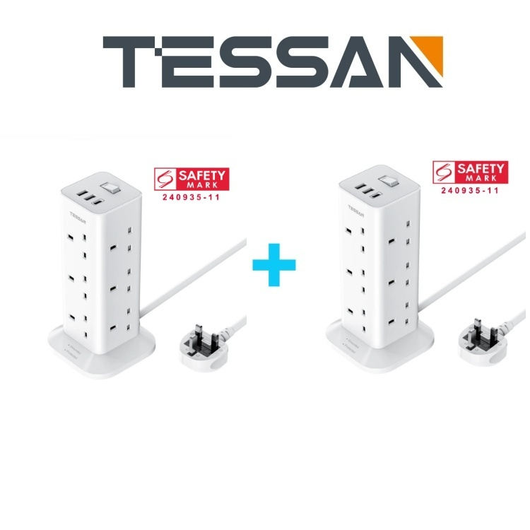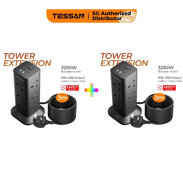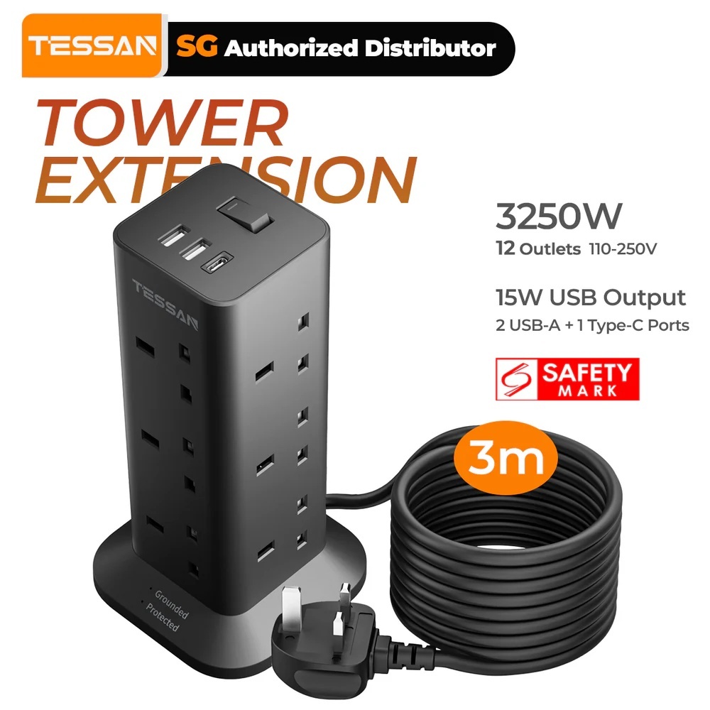 TESSAN - SG Safety Mark Extension Socket Tower with USB & Type C Surge Protector Power Cord Strip
