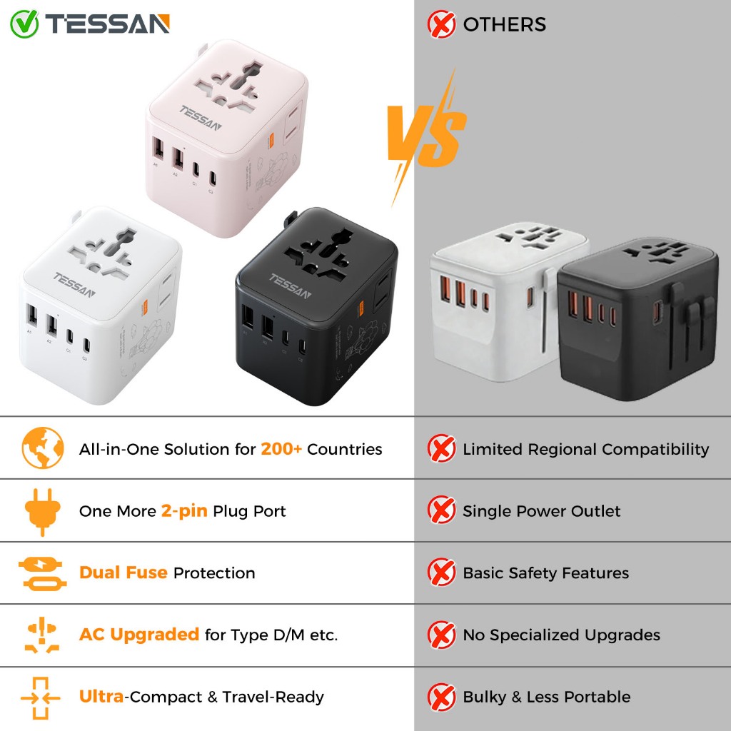 TESSAN Universal Travel Adapter with USB+Type C Plug Portable Charger for JP KR ID TH TW AU