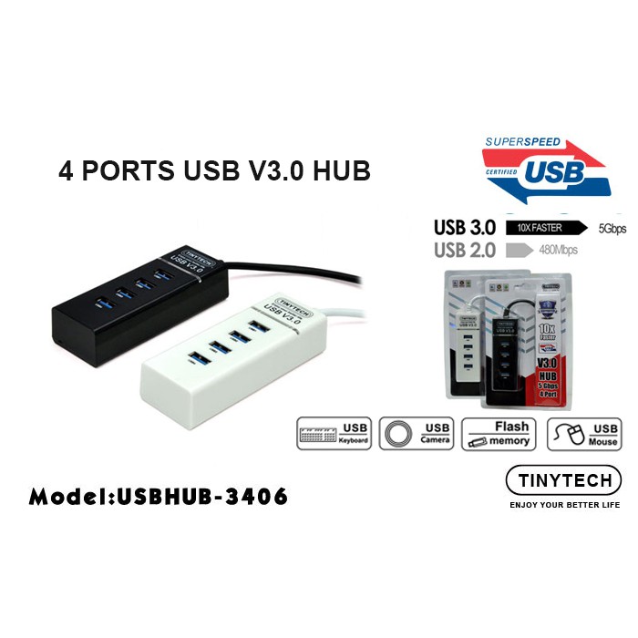 TINYTECH USB 3.0 SUPER SPEED 4 PORT USB HUB FOR PC / LAPTOP (USBHUB-3406)