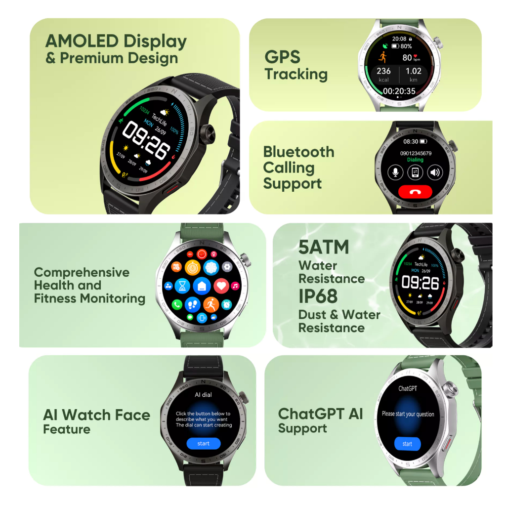 TechLife Smart Watch P1 | AMOLED Display & Premium Deisgn | Bluetooth Calling Support | GPS Tracking