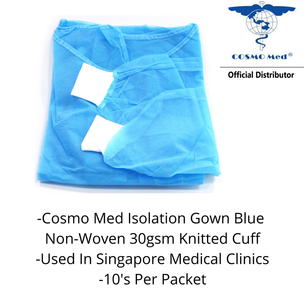 【SG Ready Stock】Cosmo Med Isolation Gown Blue Non-Woven 30gsm Knitted Cuff 10's/packet