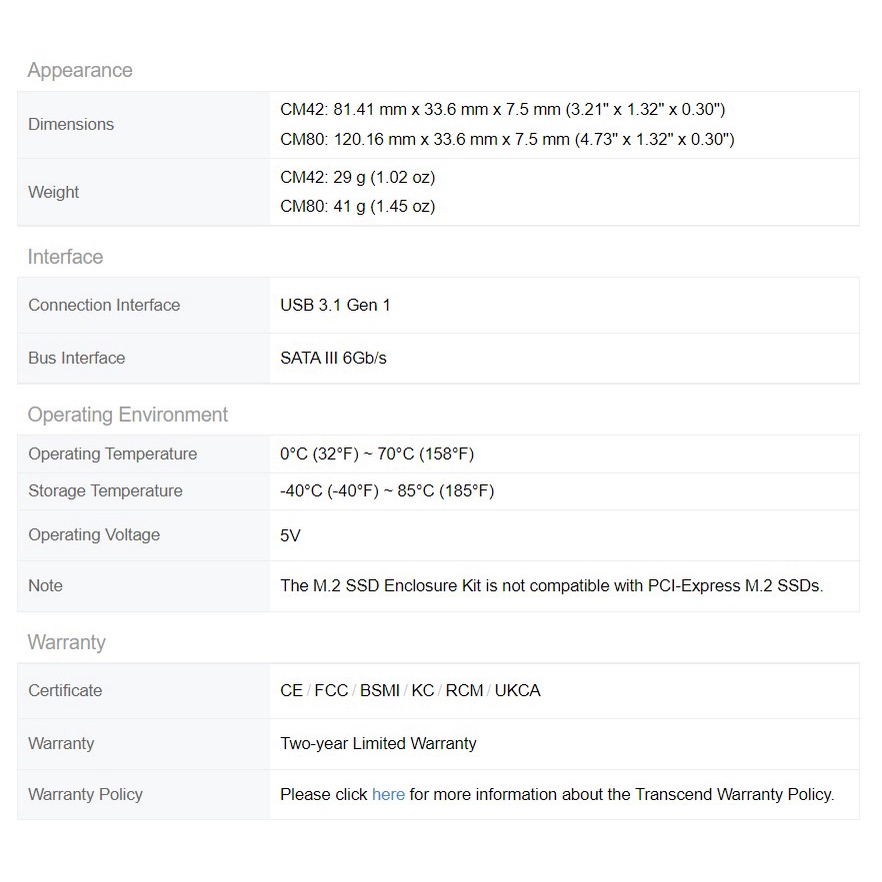 Transcend USB 3.1 M.2 SATA Enclosure Kit Type 2242 - TS-CM42S
