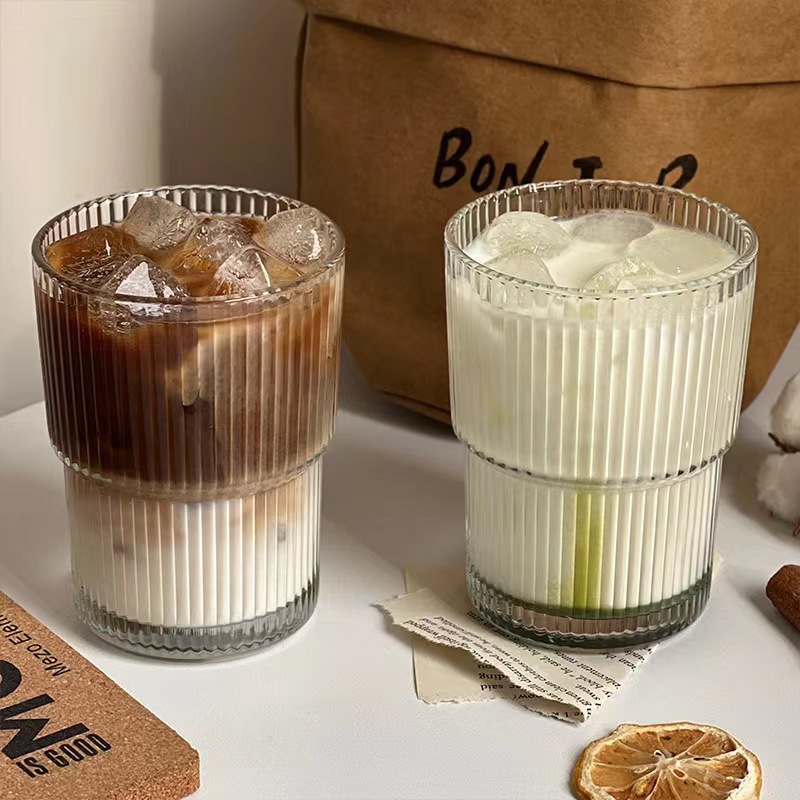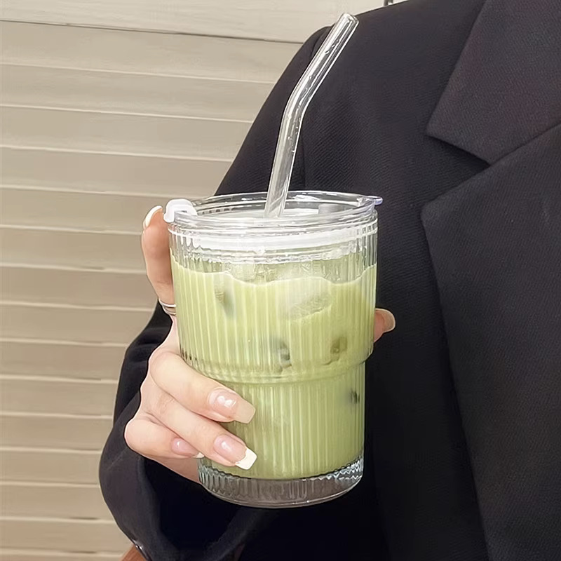 Vertical Stripe Glass Straw Cup - Stylish Reusable Drinkware for Iced Coffee and Lattes