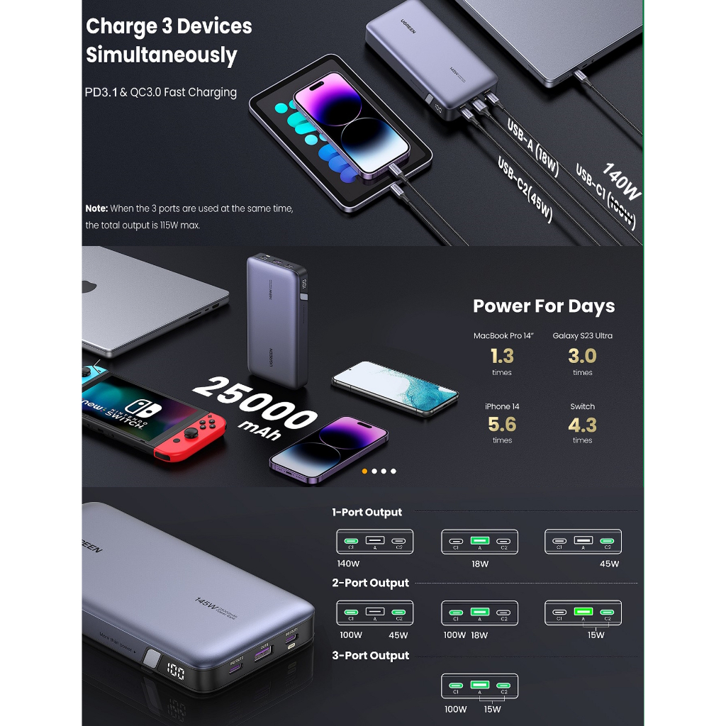 UGreen 25000mAh Power Bank,145W Portable Charger,Compatible with MacBook Pro, iPhone 15/14/13 Series, Samsung, AirPods
