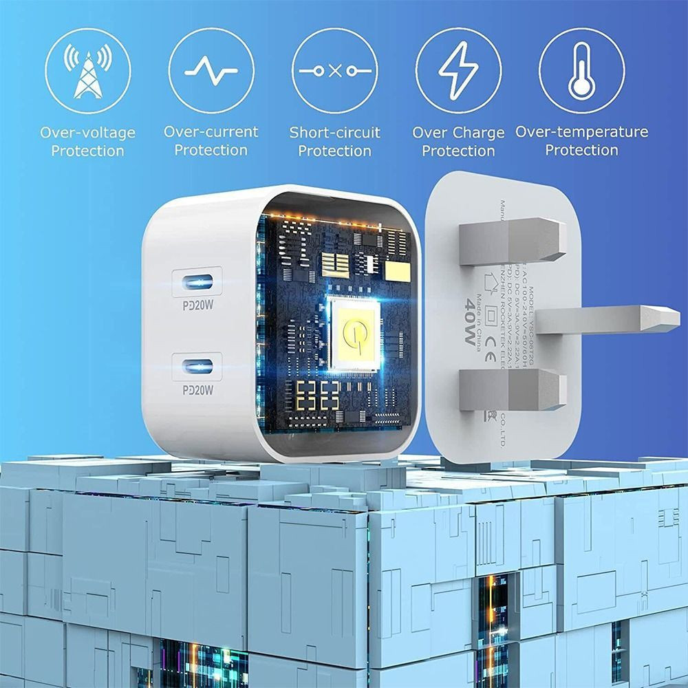 UK Plug Dual Type-C Charger 40W PD Fast Charging Home Travel Office Use