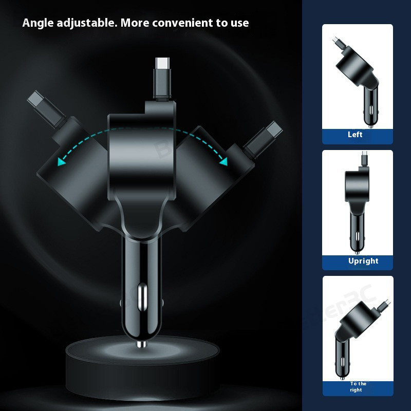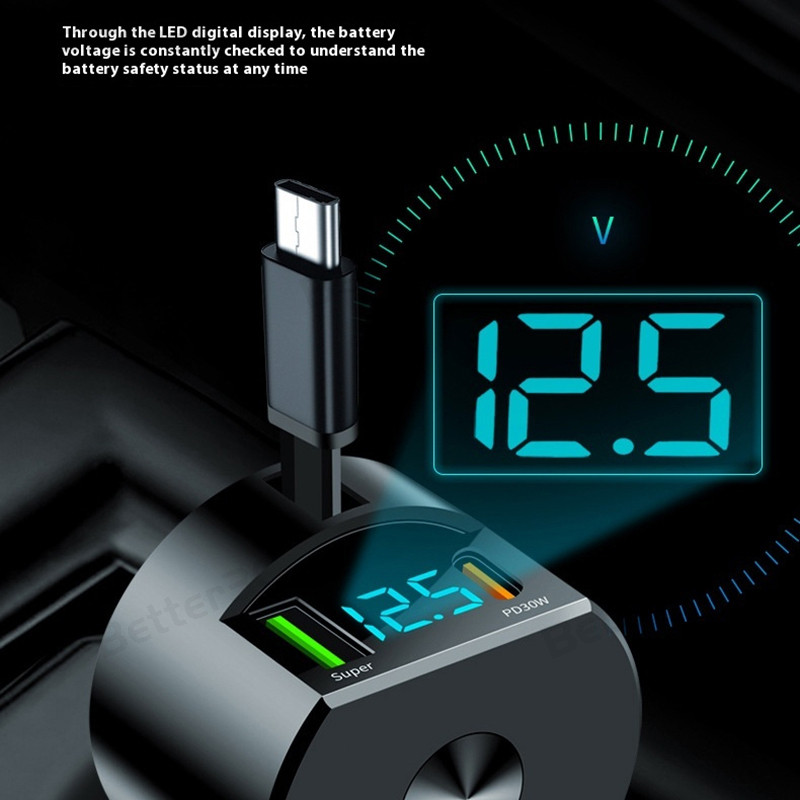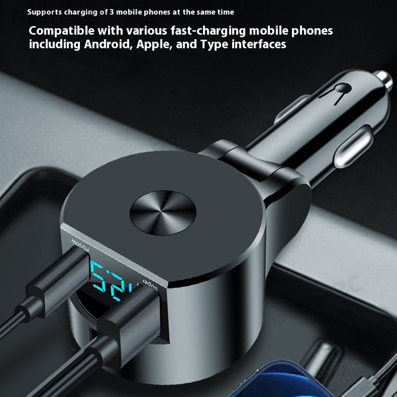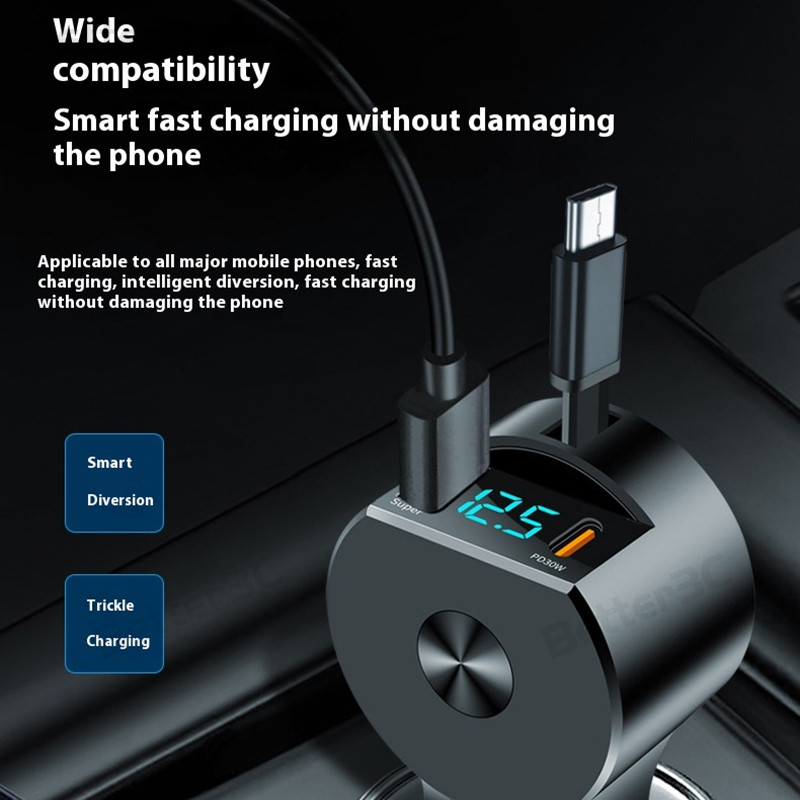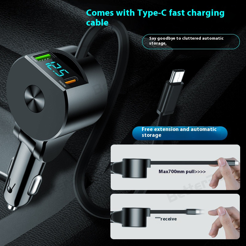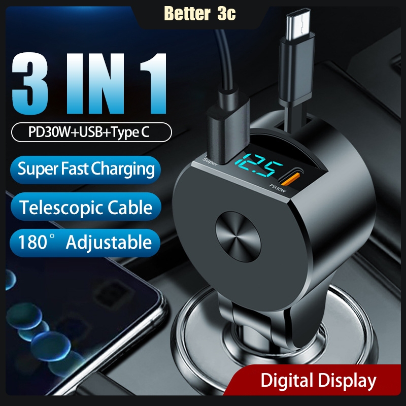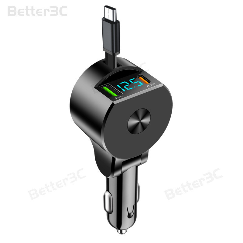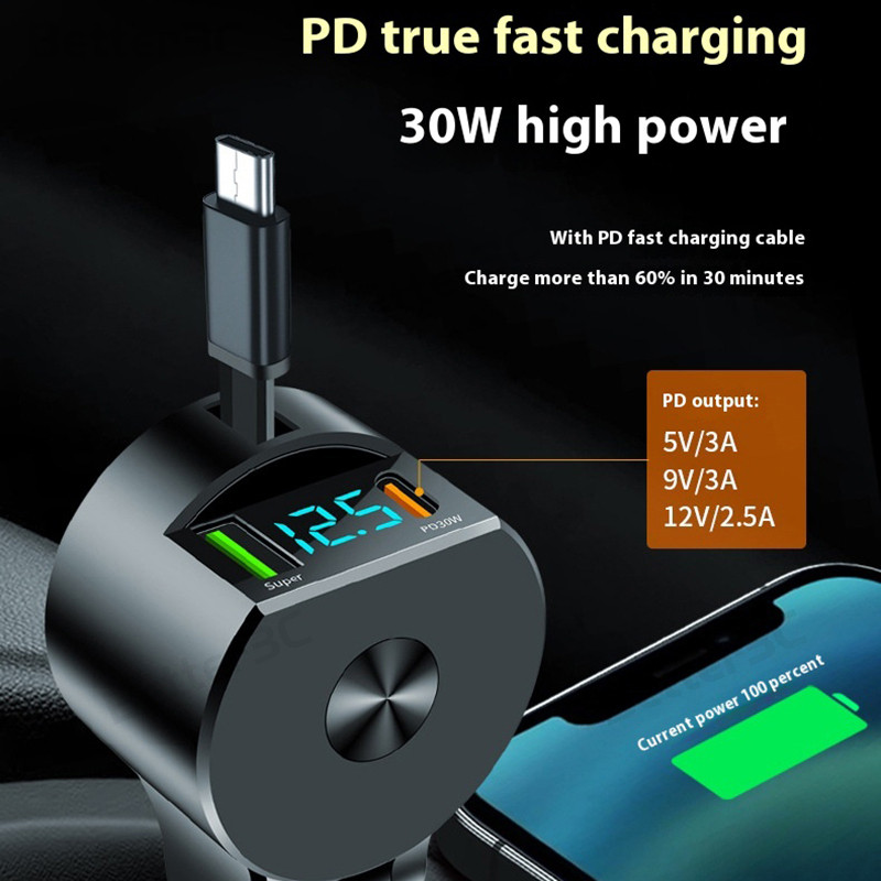 USB+PD30W+Type C super fast charger with LED Digital Display Telescopic Cable Car Charger Car Lighter Adapter USB C Car Travel Charging Adoptor