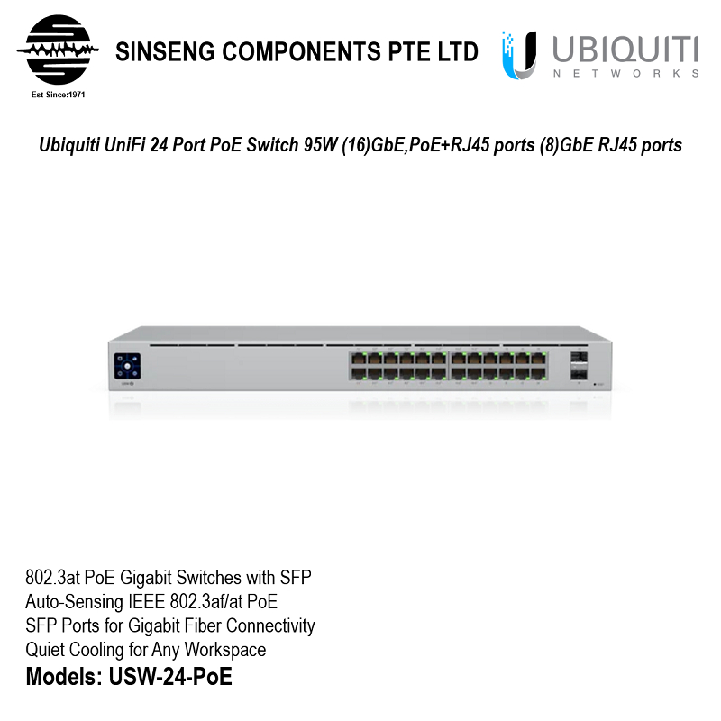 Ubiquiti UniFi USW-24-POE 24 Port PoE Switch 95W (16)GbE,PoE+RJ45 ports (8)GbE RJ45 ports - 1 Year Local Warranty