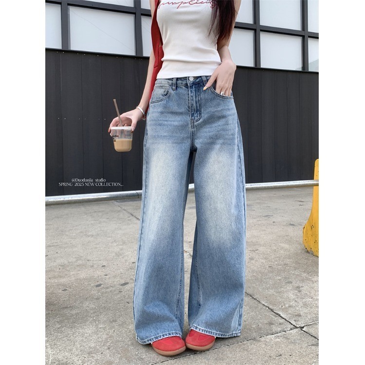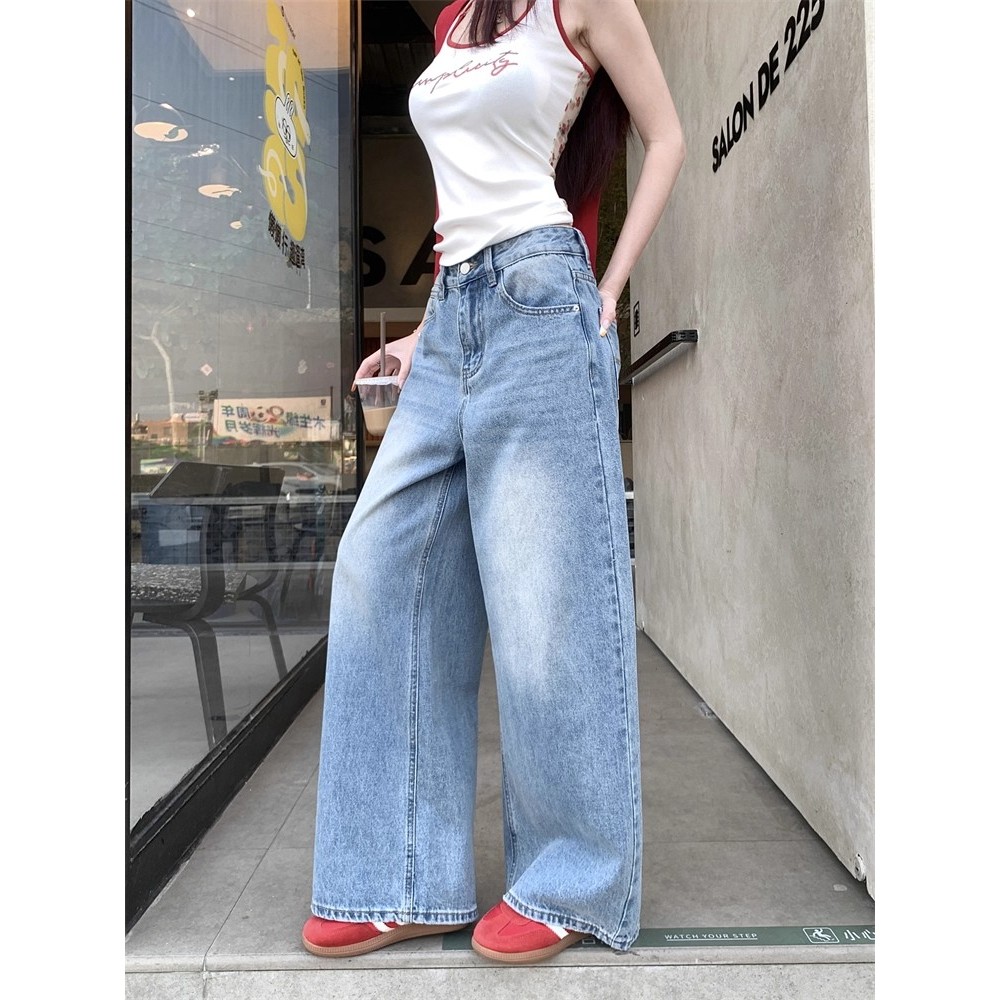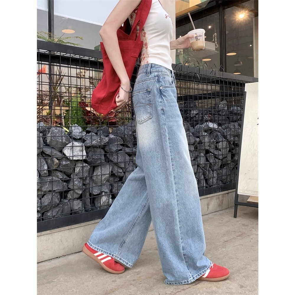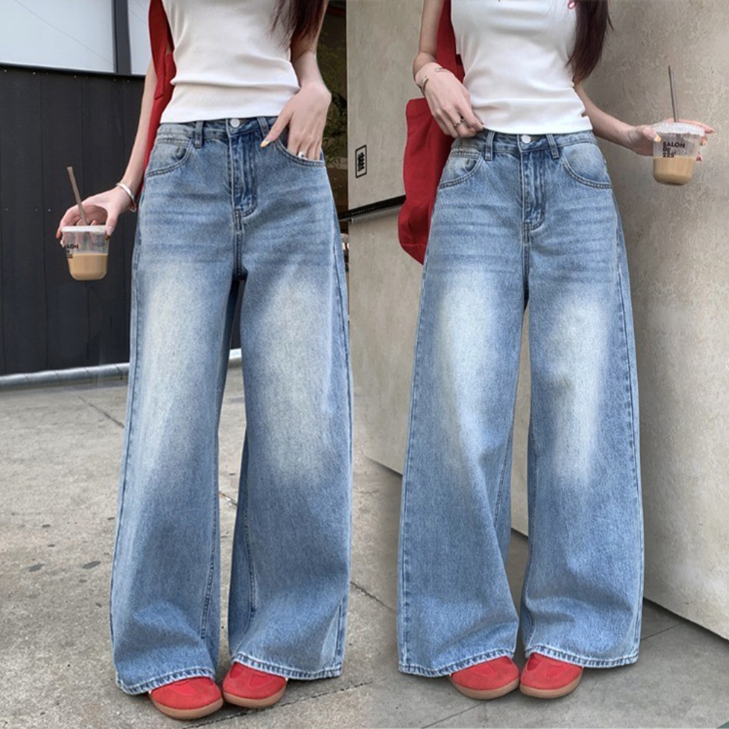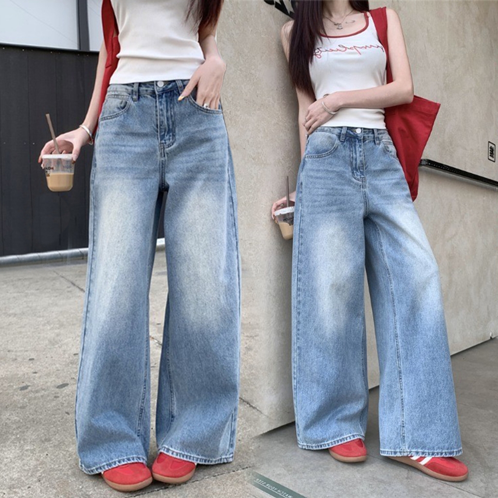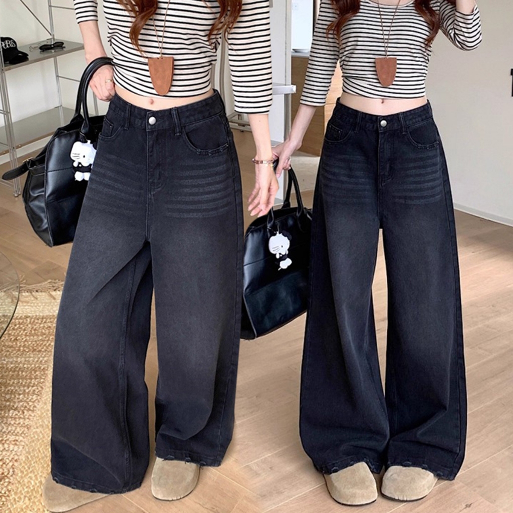 S-5XL~Long jeans Wide-leg pants for women girl black blue denim baggy straight loose Korean highwaist casual bigsize