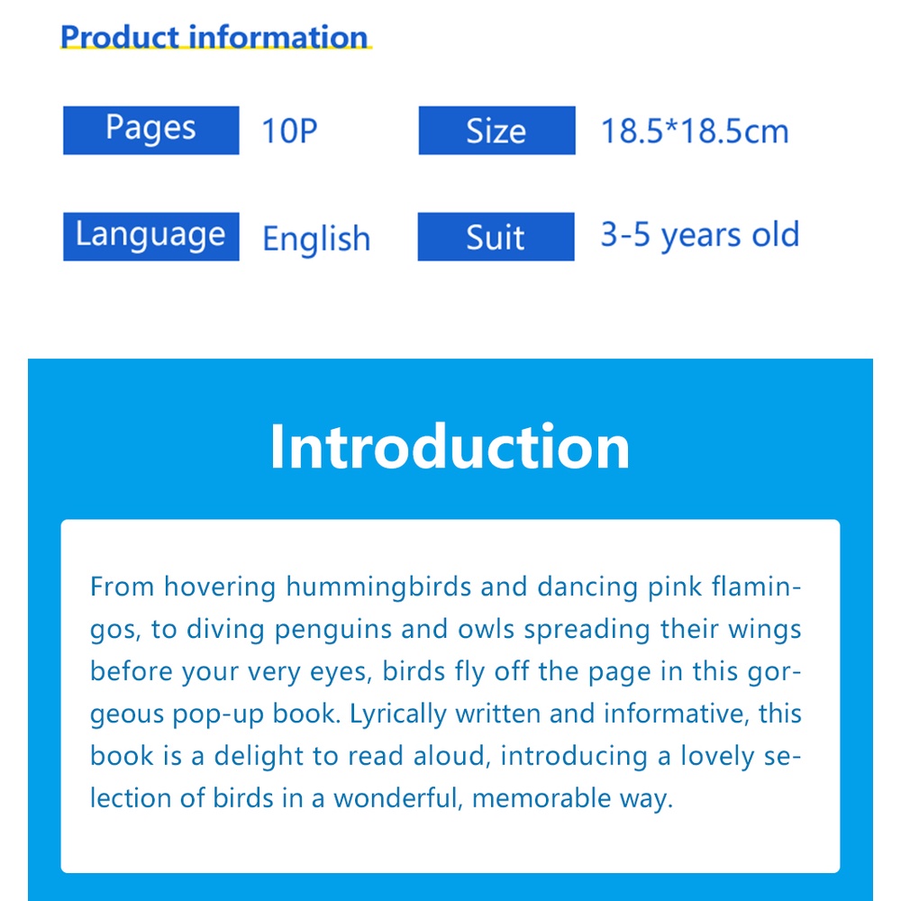 Usbrone Pop Up Birds English Educational 3D Flap Picture Cardboard Books Children Kids Reading Book