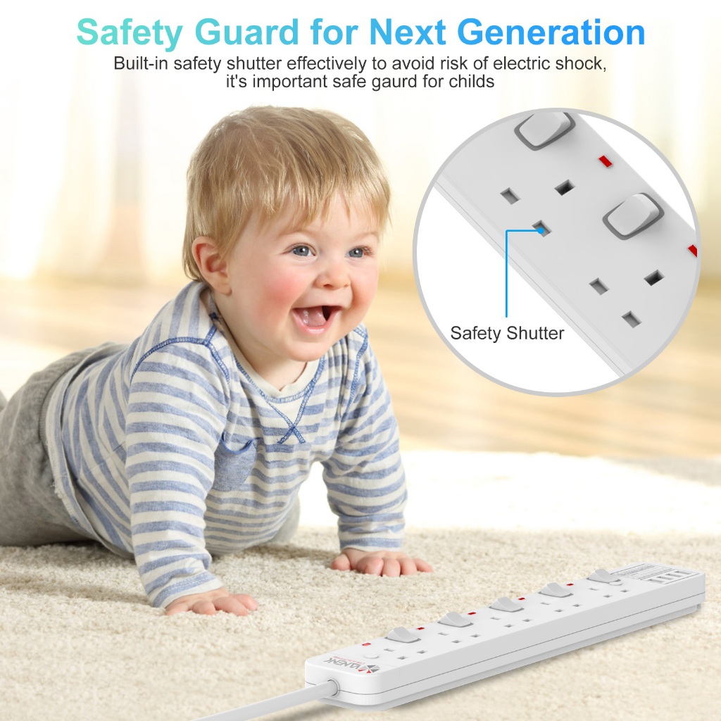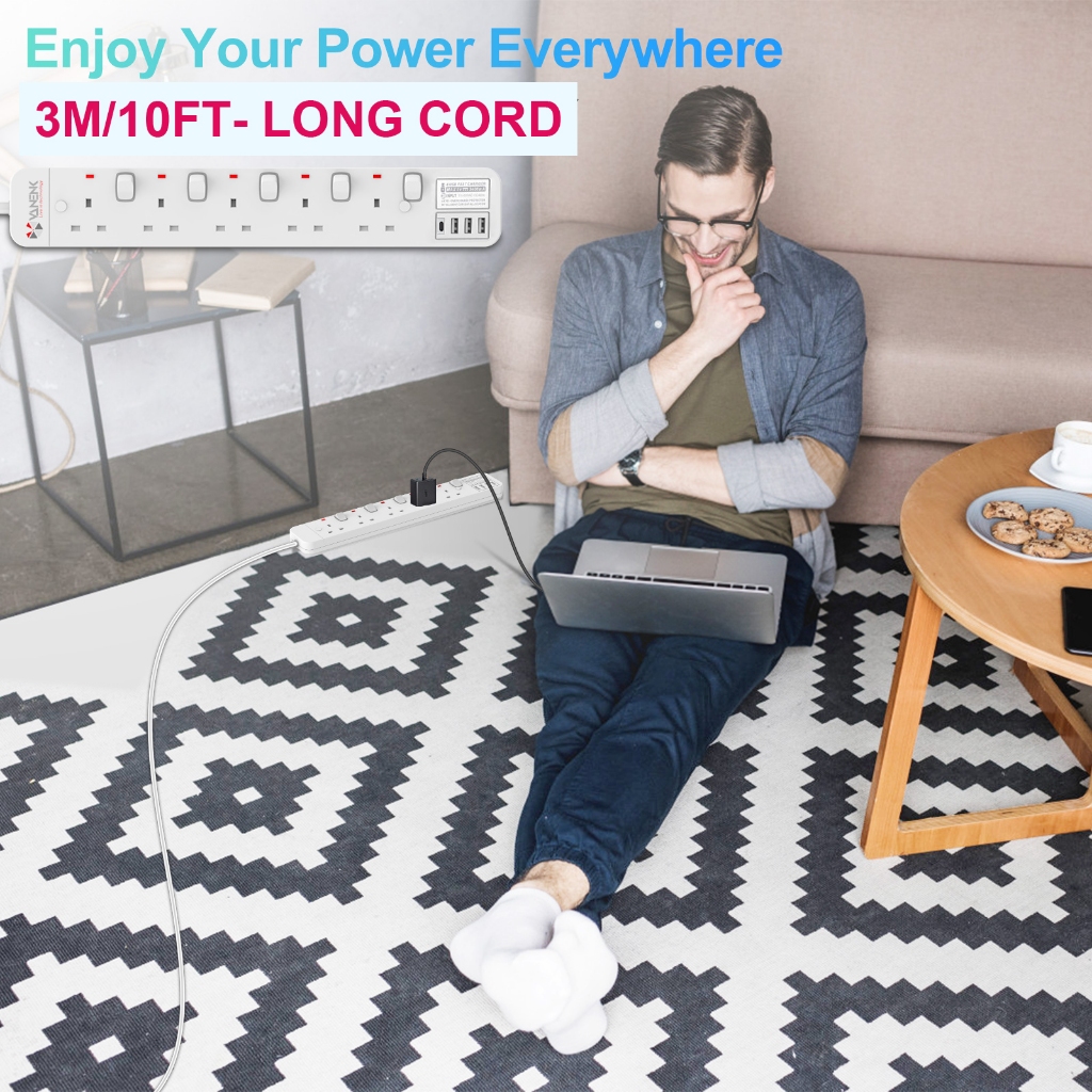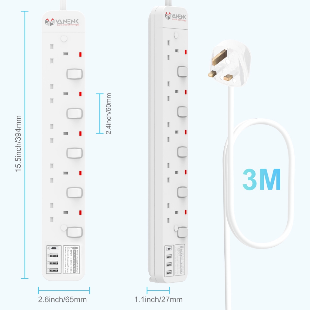 VANENIK Heavy Duty Power Strip Extension Socket with USB C Fast Charger PD20W Extension Cord 3M Trailing Socket