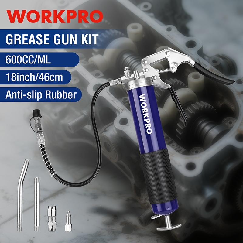 WORKPRO Grease Gun Kit 6000PSI Heavy Duty Grease Gun with 18inch Flexible Hose 2 Fixed Tubes and 3 Nozzles Load