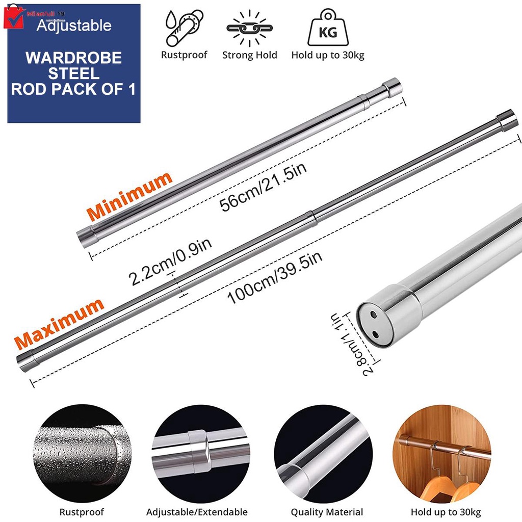 Wardrobe Rail Extendable Clothing Rail 56cm-100cm Stainless Steel Clothes Rod with End Sockets Screws