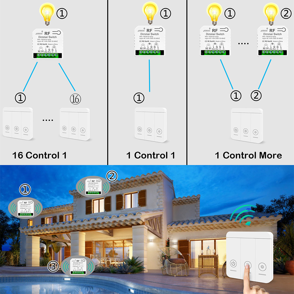 Wireless Dimmer Light Switch with Remote Controls AC110V 220V Dimmable Switch Control for LED and Halogen10W-150W (No Wifi)