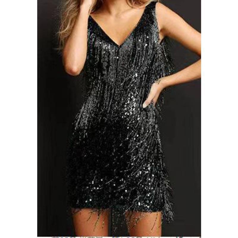 Women Mini Party Dresses Sexy V-neck Sleeveless Tassel Slim Dress