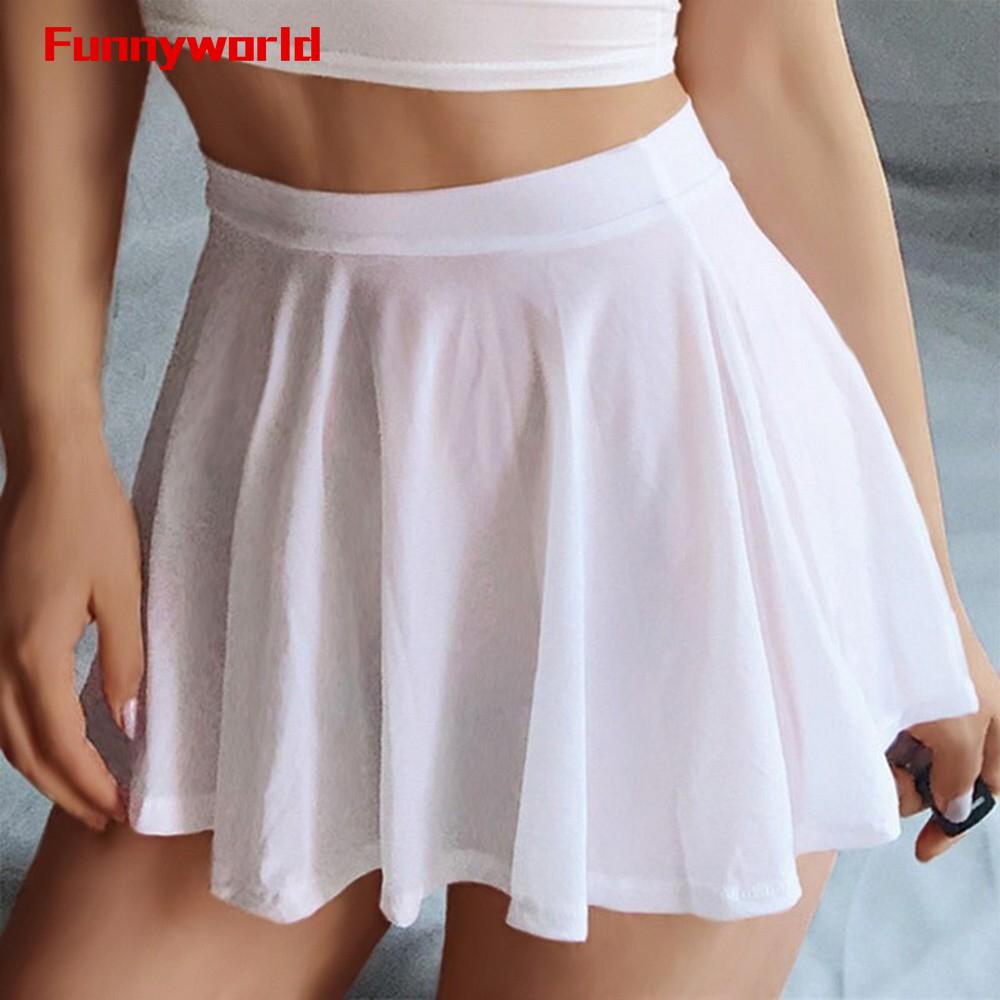 Women Pleated Mini Skirt A-Line Sexy Sheer Translucent Skirts Solid Color