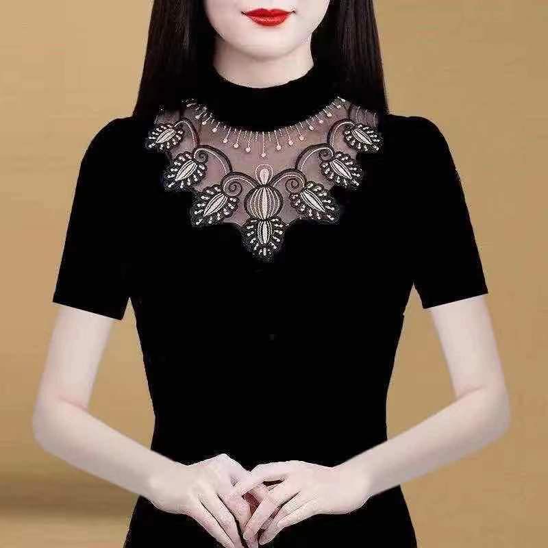 Women short Sleeve Shirts Thin Casual Fashion Loose Shirt Tops Western Style Hollow Lace Net Yarn Bottoming Large Size