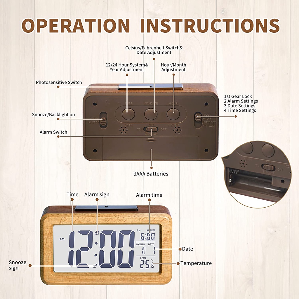 Wooden Digital Alarm Clock, Large LED Display, 12/24 Hours Display,Smart Sensor Night Light,Date,Snooze and Temperature,