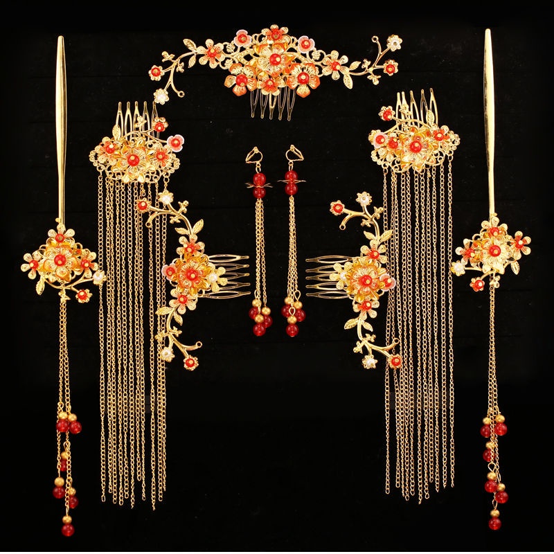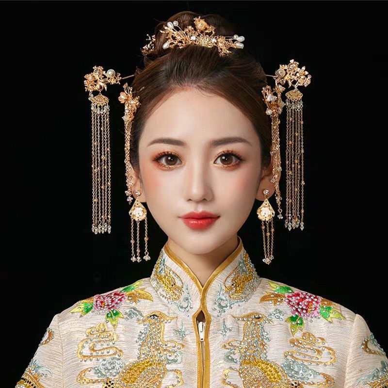 Xiuhe clothing Coverdress bride headdress Bridal Chinese Hanfu Suit Tassel Dragon Phoenix Gown Ancient Style Hair Accessories Wedding Red Costume Crown 3.15
