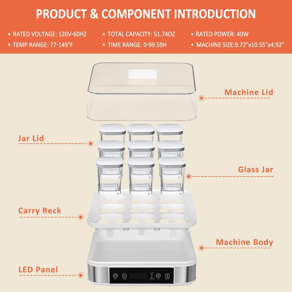 Yogurt Maker, Automatic Digital Yogurt Maker with Adjustable Temperature & Time Control, 9pcs Glass Jars 52 Oz Stainless Steel Yoghurt Maker for Home Organic Yogurt, Cheese Maker