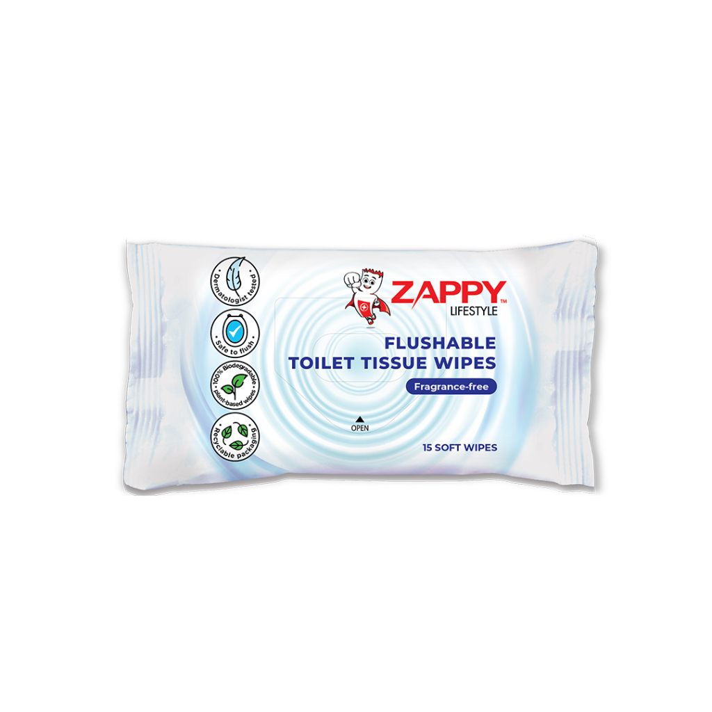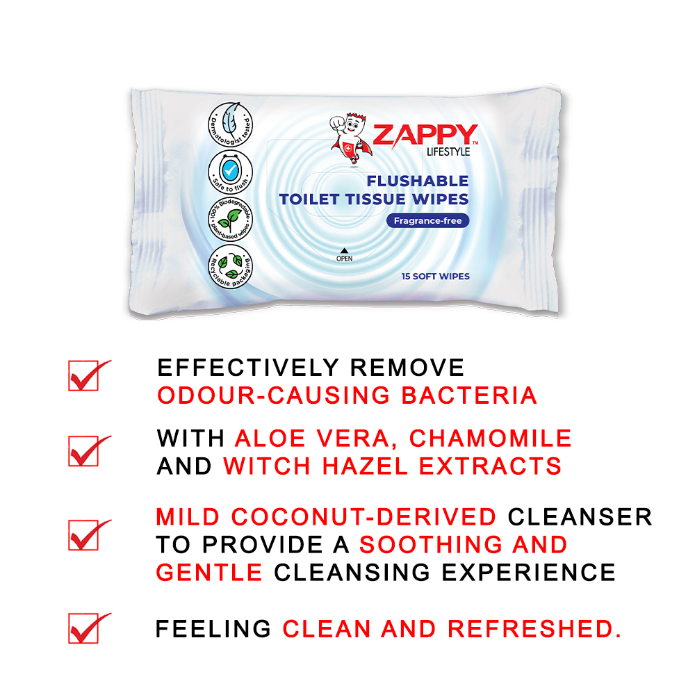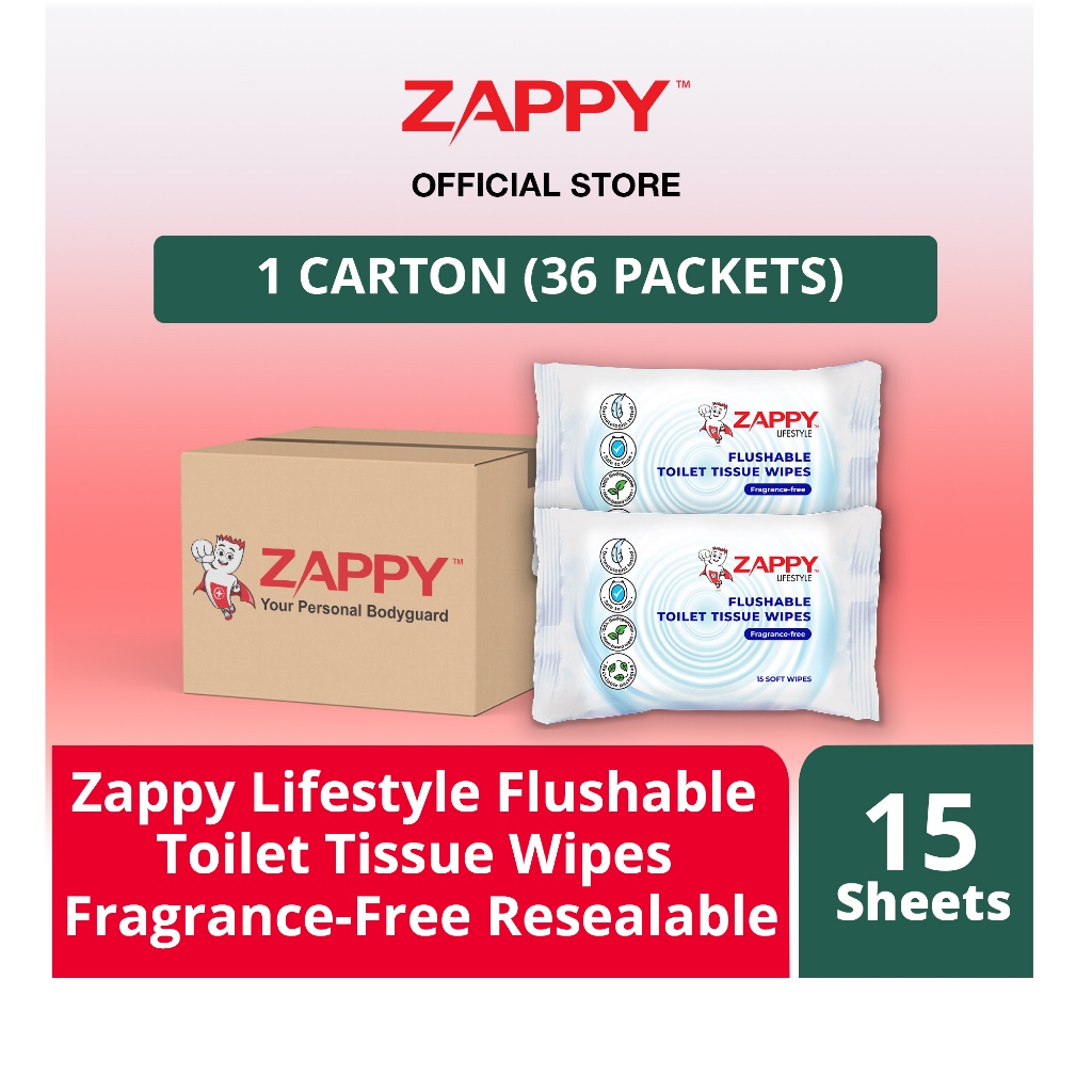 Zappy Lifestyle Flushable Toilet Tissue Wipes Fragrance-Free 15 Sheets Resealable