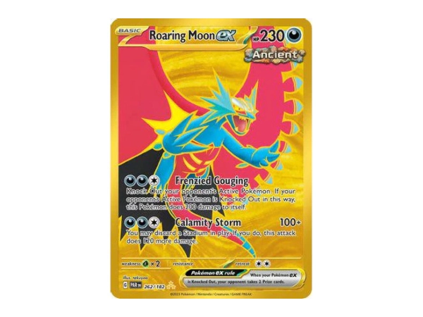 One of the most hyped decks from the Paradox Rift expansion, Roaring Moon ex has made a ferocious entry into the meta. This Dark-type Pokémon ex hits the field with the Frenzied Gouging attack, which can knock out the opponent’s Active Pokémon in one blow at the cost of some self-damage. In fact, Roaring Moon ex can even take a KO on the very first turn of the game – an almost unheard-of feat, making it a terrifying opponent.