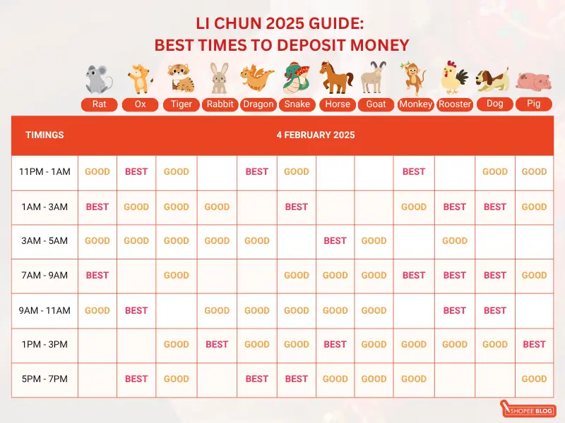 We’ve noticed that the busiest time for Li Chun will be on 4 February 2025, specifically from 9am to 11am and again from 1pm to 3pm. If your most auspicious timings (for signs like Rat, Monkey, or Rooster) fall outside these peak hours, try to plan your deposits for those quieter periods.