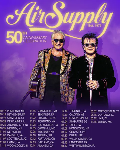 Five decades of love songs delivered with warmth, charm, and those still-soaring harmonies. All Out of Love, Lost in Love, Making Love Out of Nothing at All – the sing-alongs write themselves. It’s nostalgia without dust, polished and heartfelt. Perfect date night, honestly.