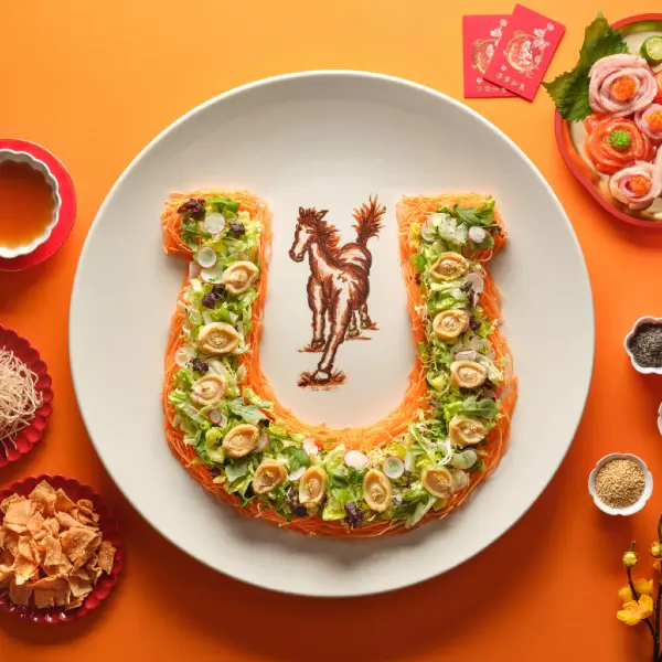 Shangri-La’s takeaway lineup includes a Happiness Yu Sheng ($70.80 – $99.80) that comes with golden crispy fish skin for extra crunch. It’s a slightly more petite platter, ideal for small families. Despite the modest price, you still get the full assortment of colourful shredded vegetables, pickled ginger, peanuts and auspicious plum sauce – all elevated by Shangri-La’s reputation. For larger gatherings, Shangri-La also offers more opulent sets, like their Fortune Yu Sheng ($149.80 – $219.80) with lobster and the Auspicious Yu Sheng ($186.80 – $258.80) loaded with abalone and scallops.