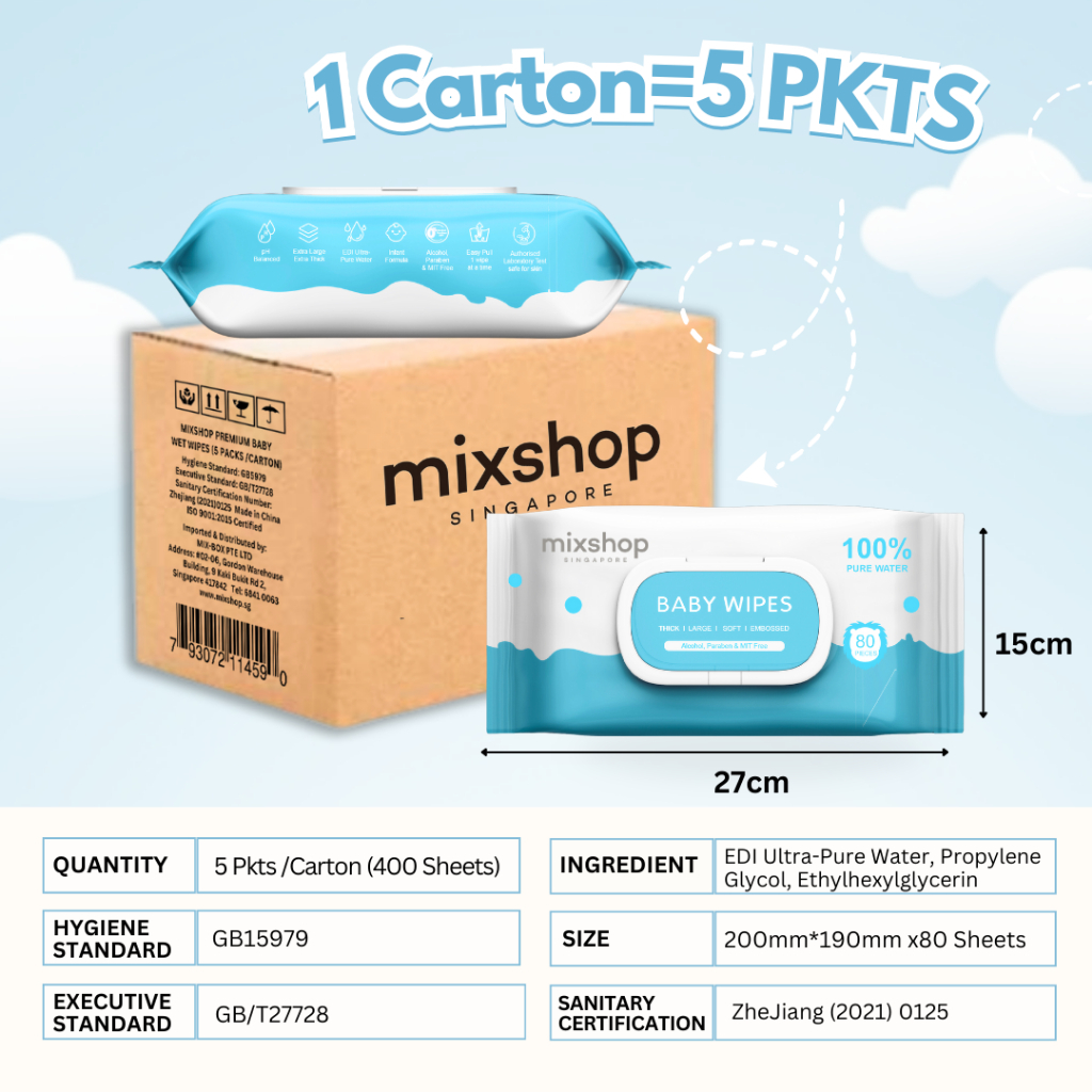 mixshop Daily use wet tissue, Premium Thick Wet Wipes, Baby wipes, 5 Packs/ Carton, 400 sheets.