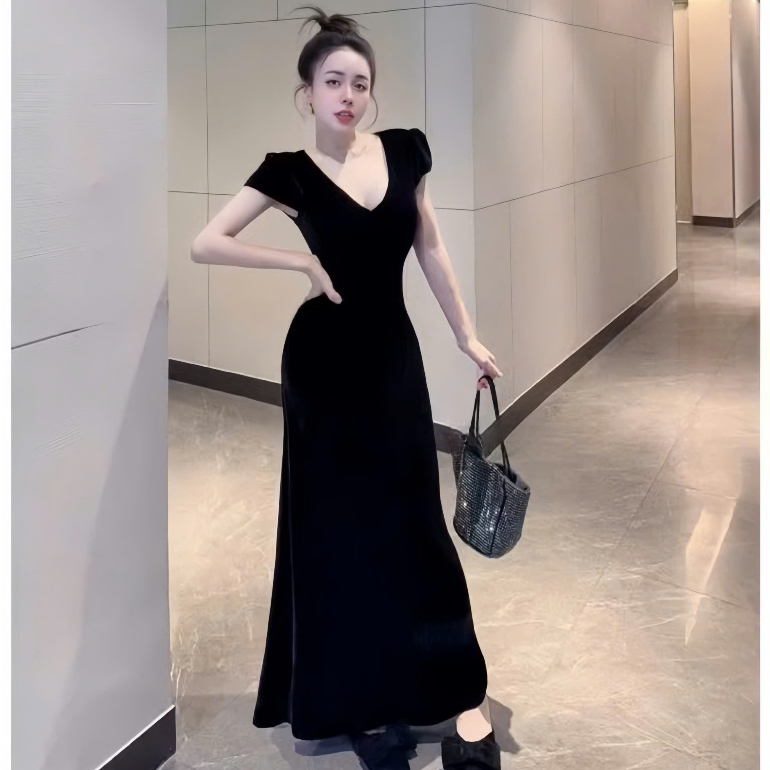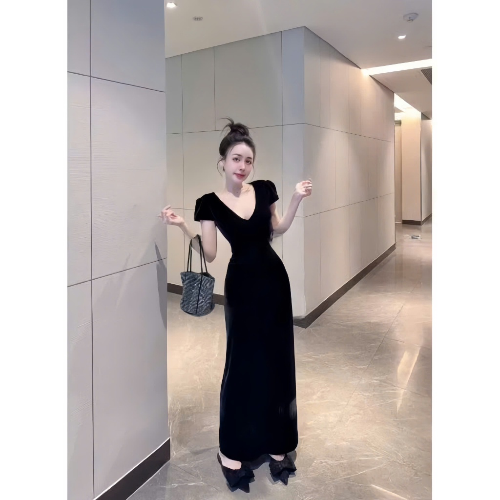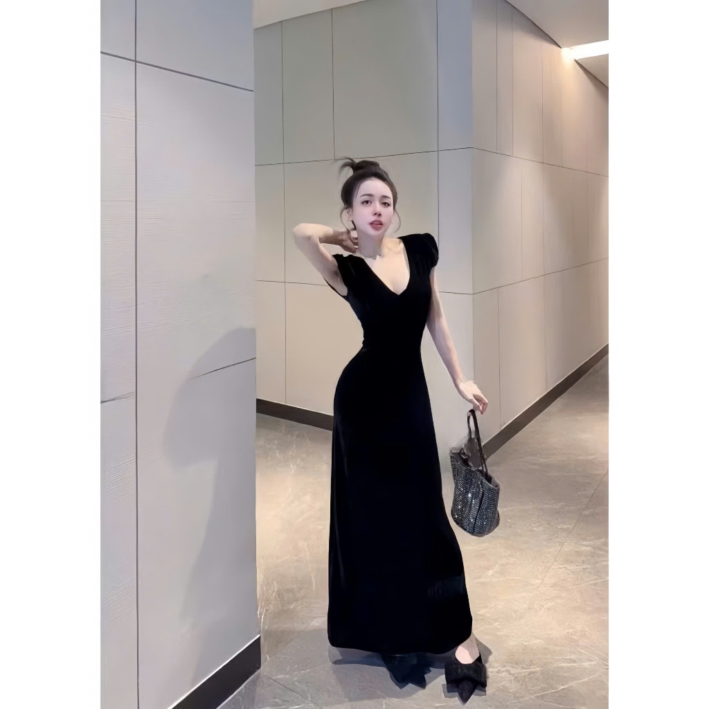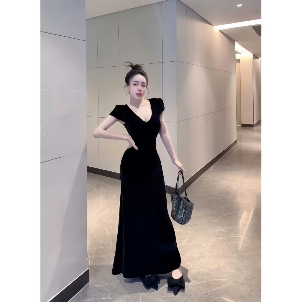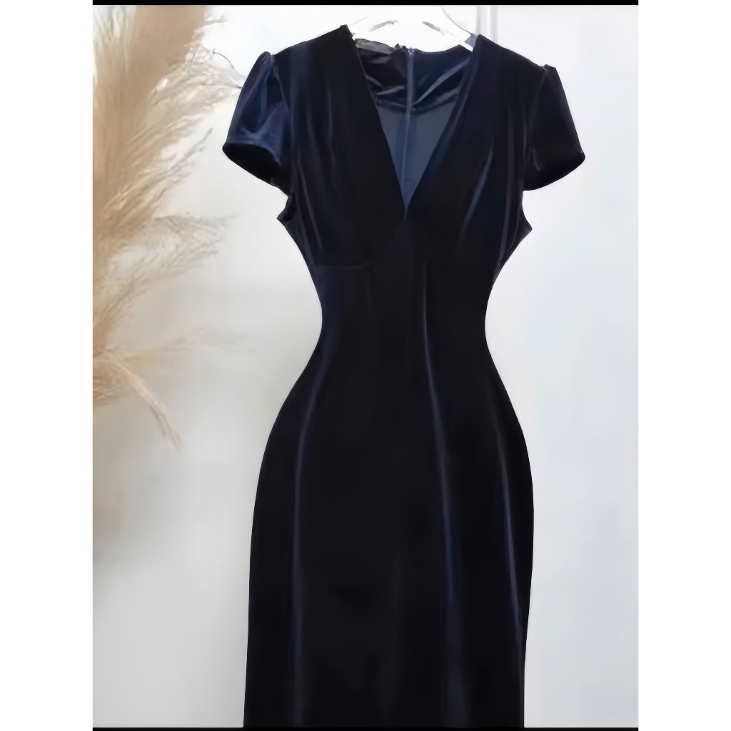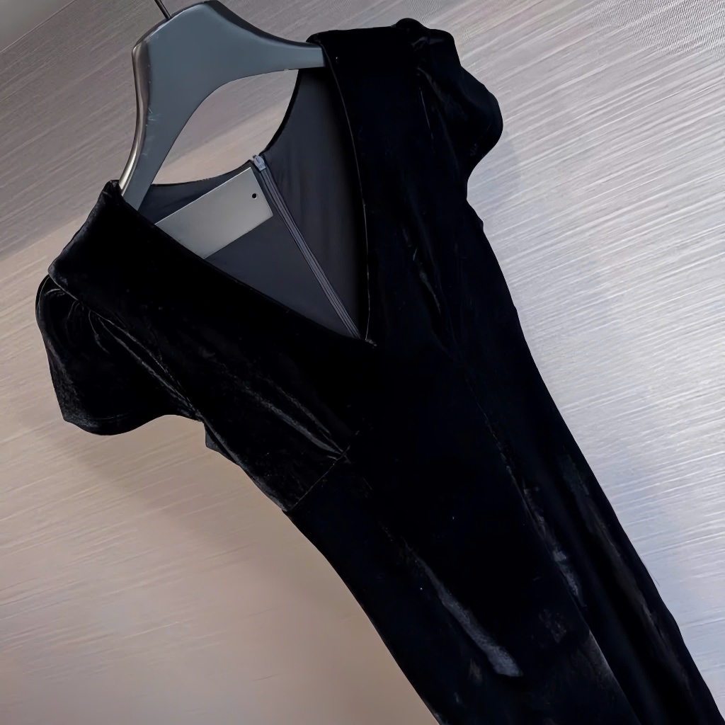 Ready to suck_Elegant and Luxurious Long Flared Short Sleeve Velvet Dress with Zipper Turtleneck_Party Dress, Beautiful Dress for Wedding Party