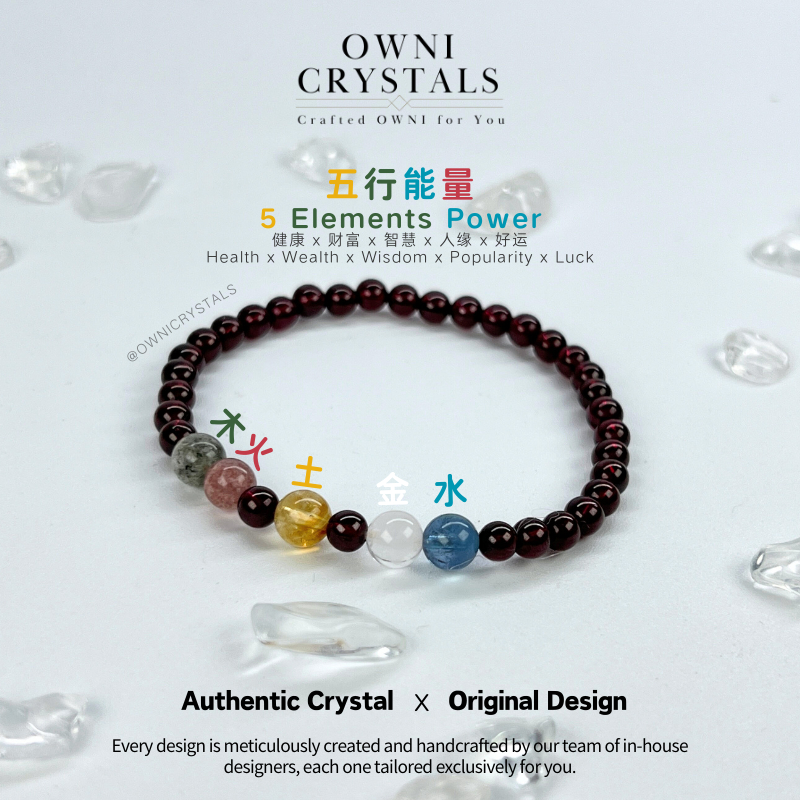 【OwniCrystos】5 Elements Balance Garnet with Fire, Water, Wood, Metal and Earth Element Natural Fengshui Crystal Bracelet