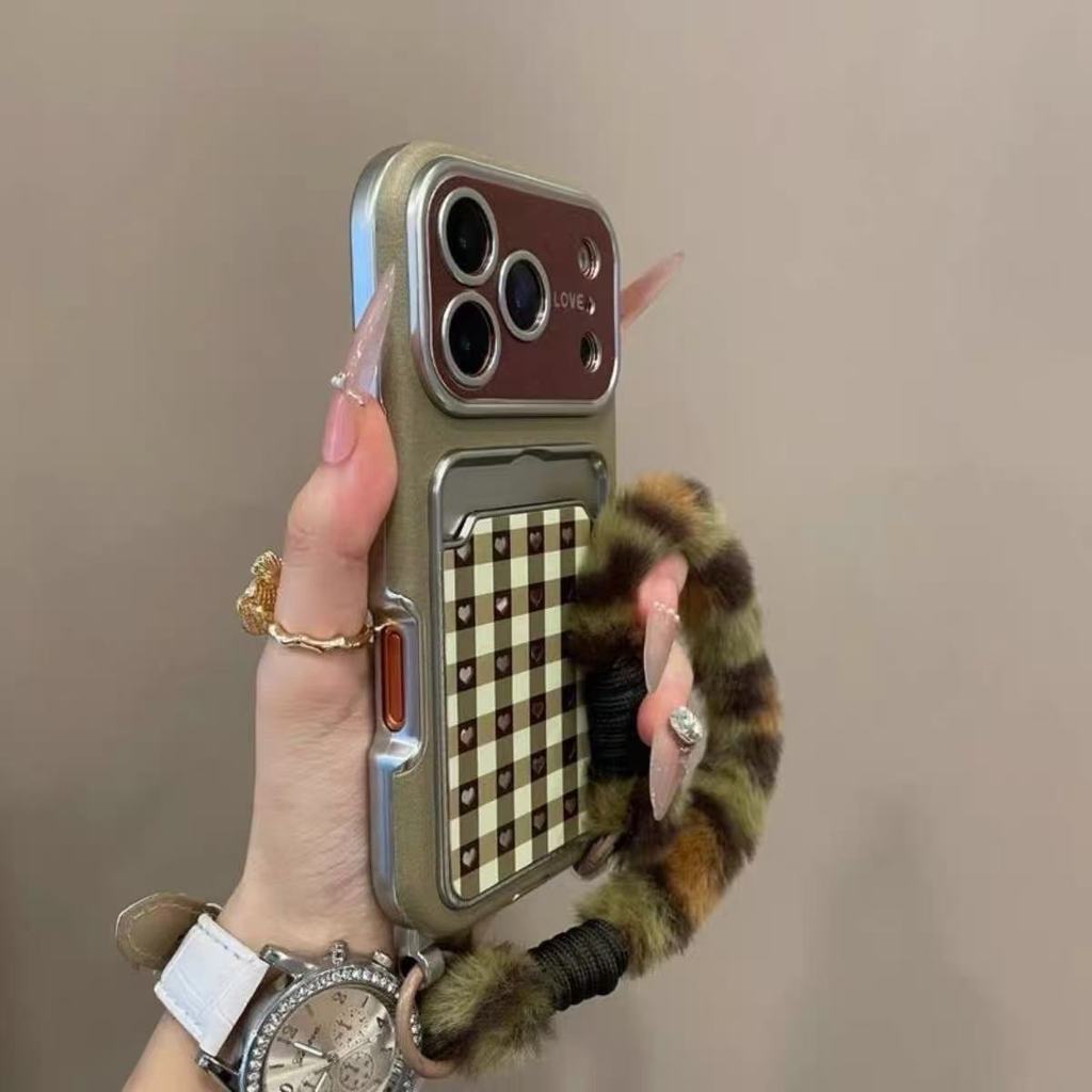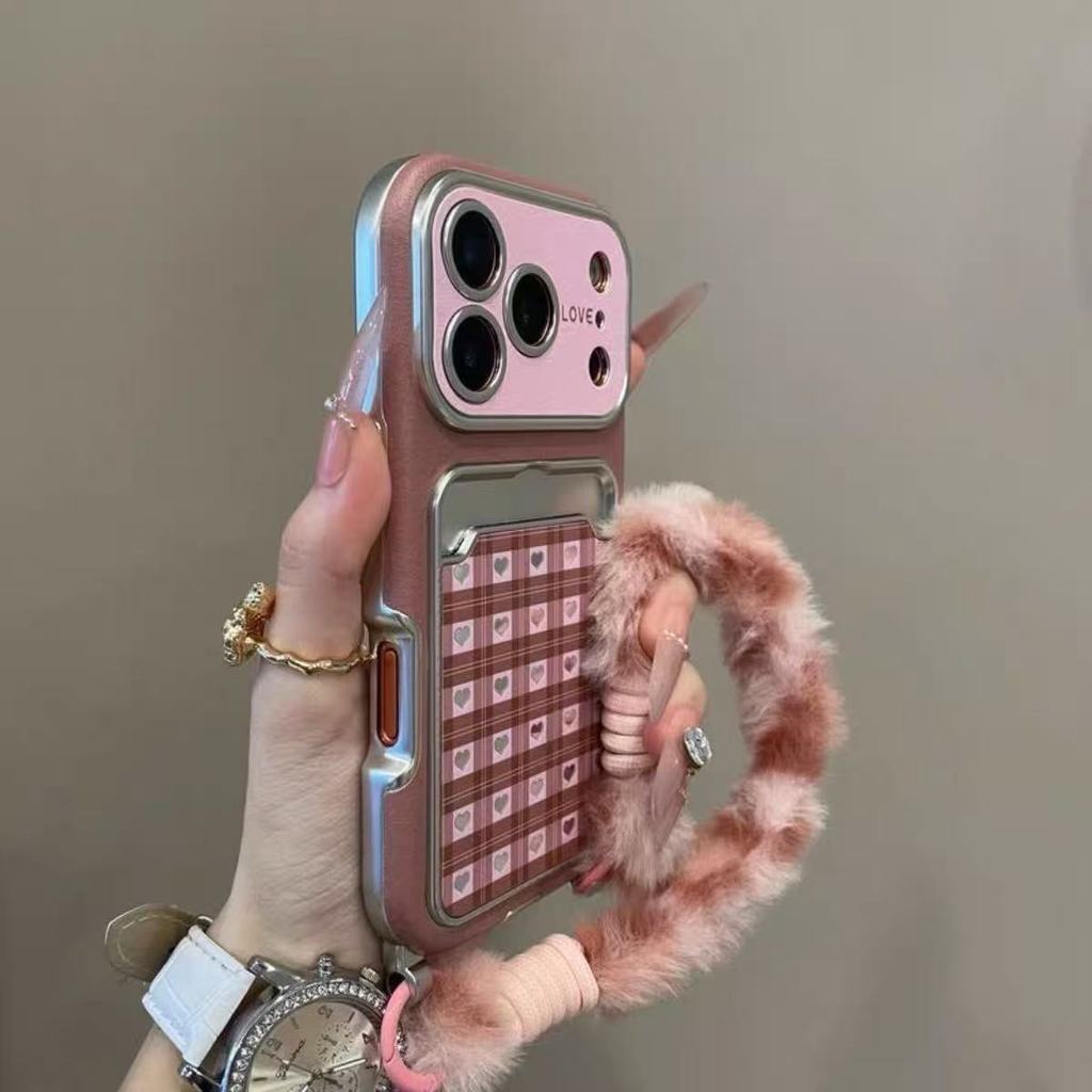 Luxury Large Window Lens Pink Checkered Love-heart Card Case Phone Case Suitable for iPhone 17 Pro Max 16 15 14 13 Pro Max Casing Shockproof Camera Protection Soft Back Cover