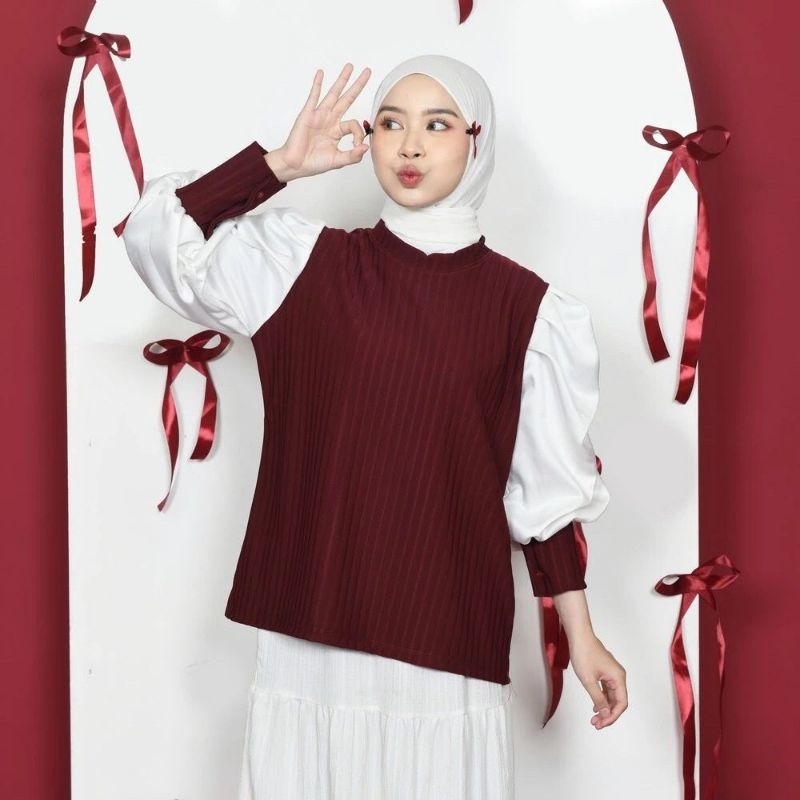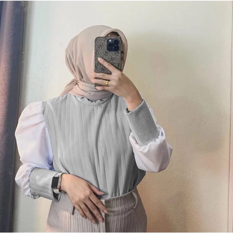 Rasha puffy top Women's top Hornet knit puff mix satin Blouse Balloon Sleeve Blouse korean style Blouse/ Blouse Women